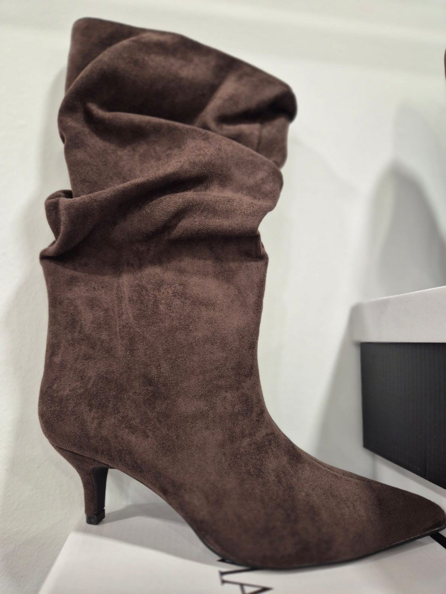 Bota en tejido de antelina. Contiene punta. Detalle de fruncido en la zona de la caña. Tacón pettite de 6 centímetros. Por tallas y único color.