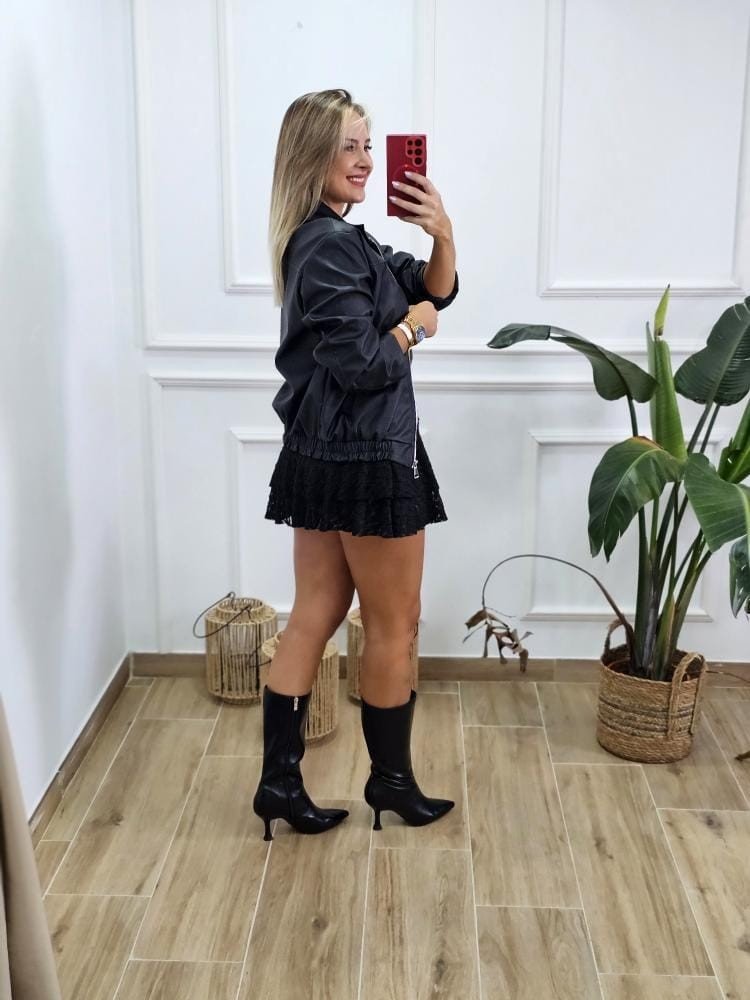 Bota de caña media en material de polipiel. Terminación en punta, cremallera interior y tacón de 5cm apróx. Único color.