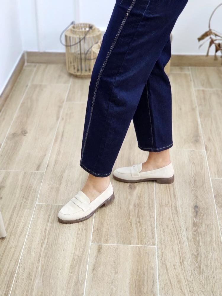 Mocasín en tejido de piel de melocotón. Contiene suela de goma. Por tallas y único color.