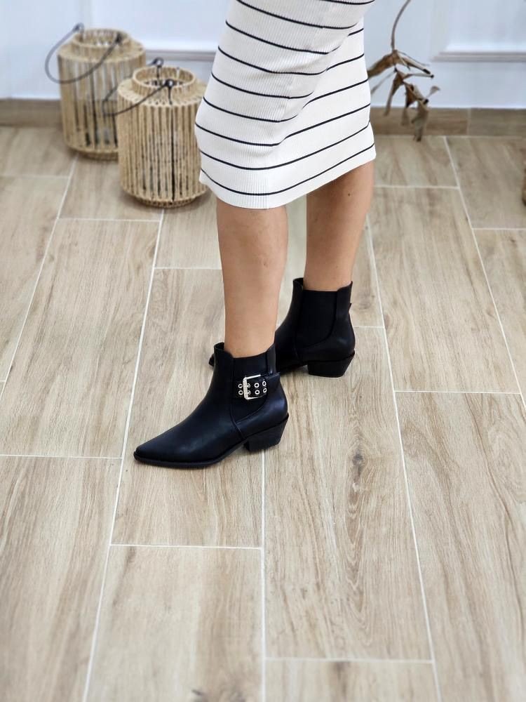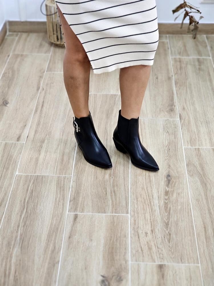 Botín de punta. Con detalle de hebilla en la para externa. Contiene pretina elástica en la zona de la caña. Por tallas y único color. NOTA: lleva puesta la talla 39.