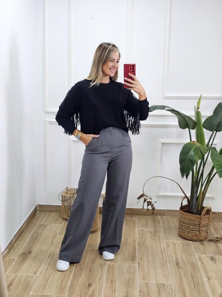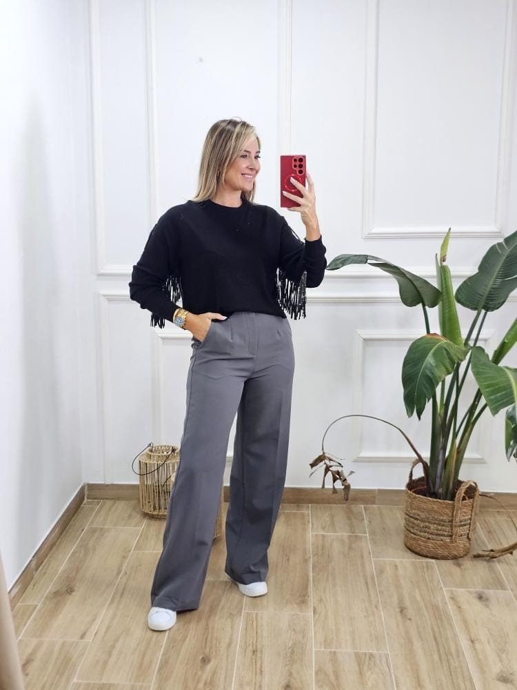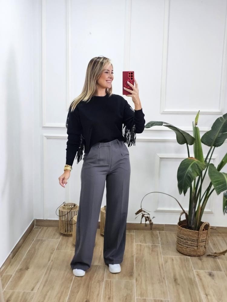 Jersey de punto de manga baja y cuello redondo. Detalle de flecos con strass en la zona de las mangas. Talla única y único color.