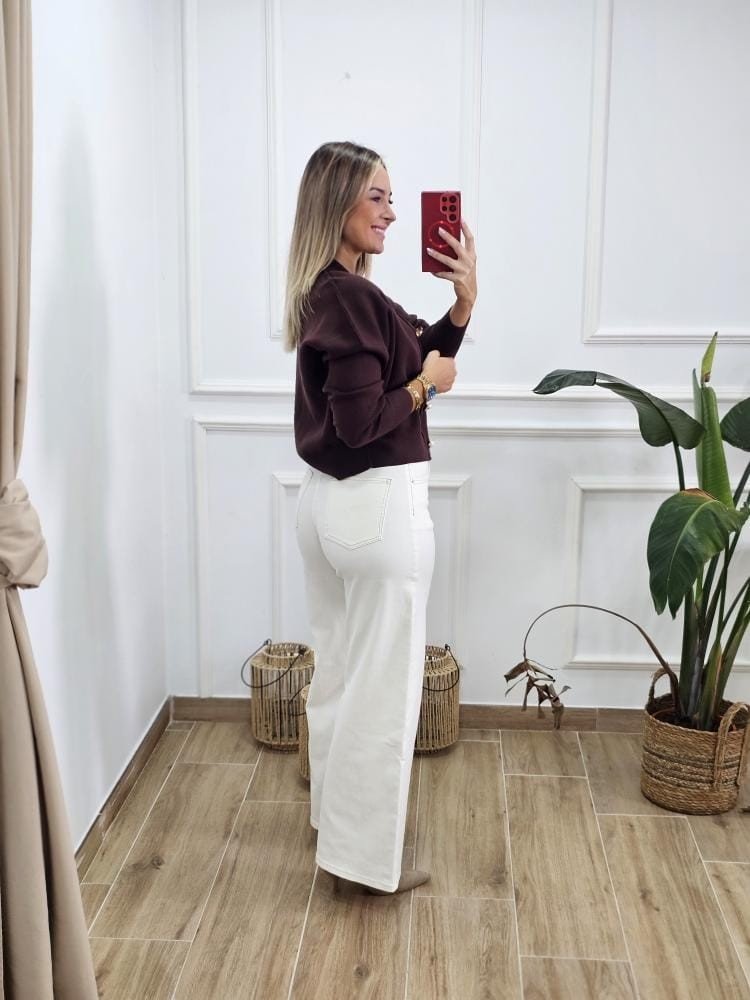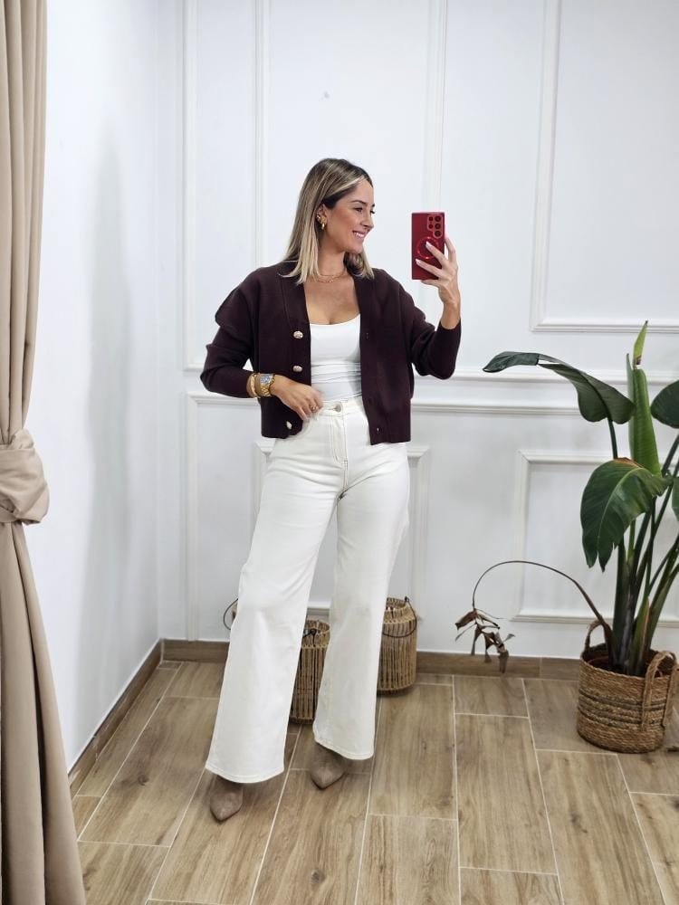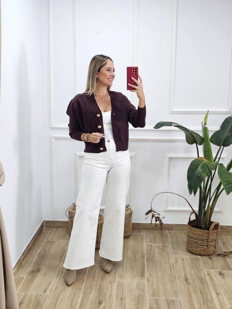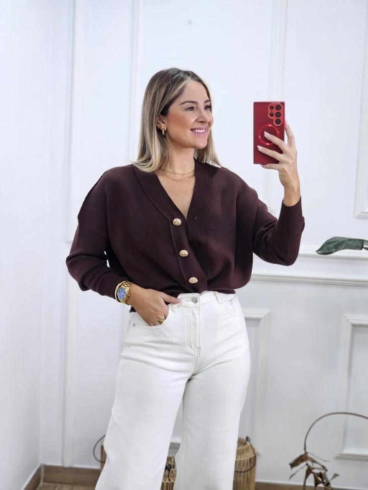 Rebeca en tejido de punto. Contiene manga baja y escote en pico. Abotonado en la zona central con botones dorados. Talla única y en varios colores.