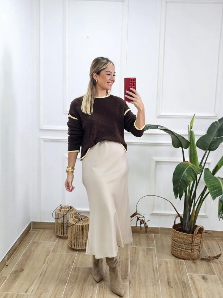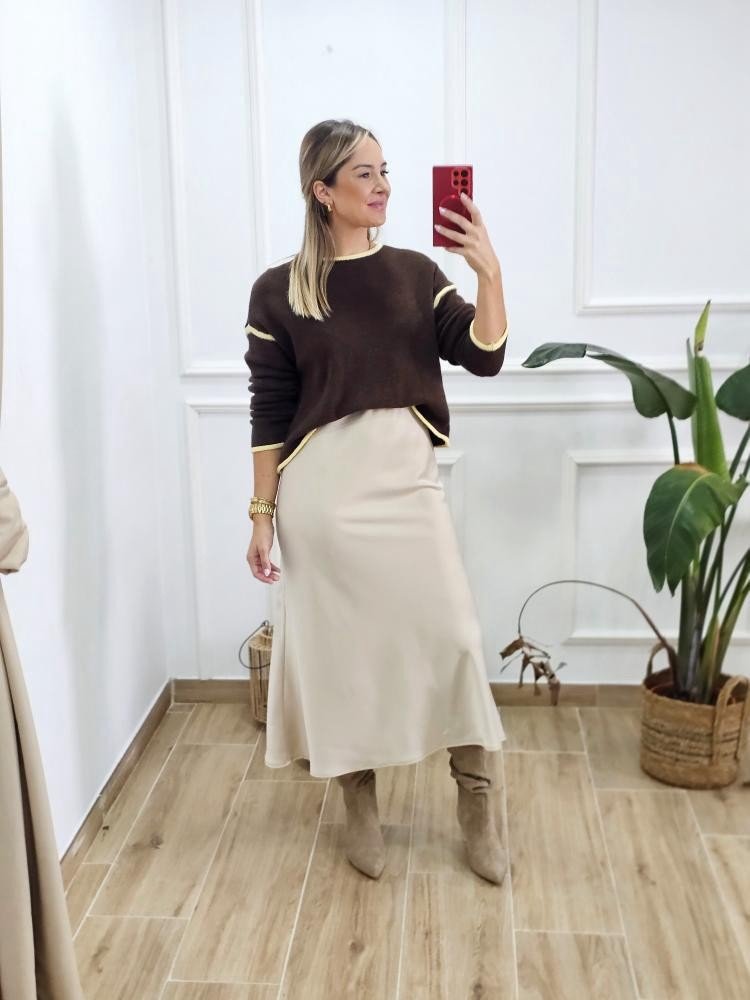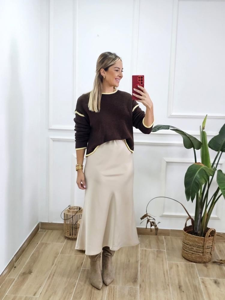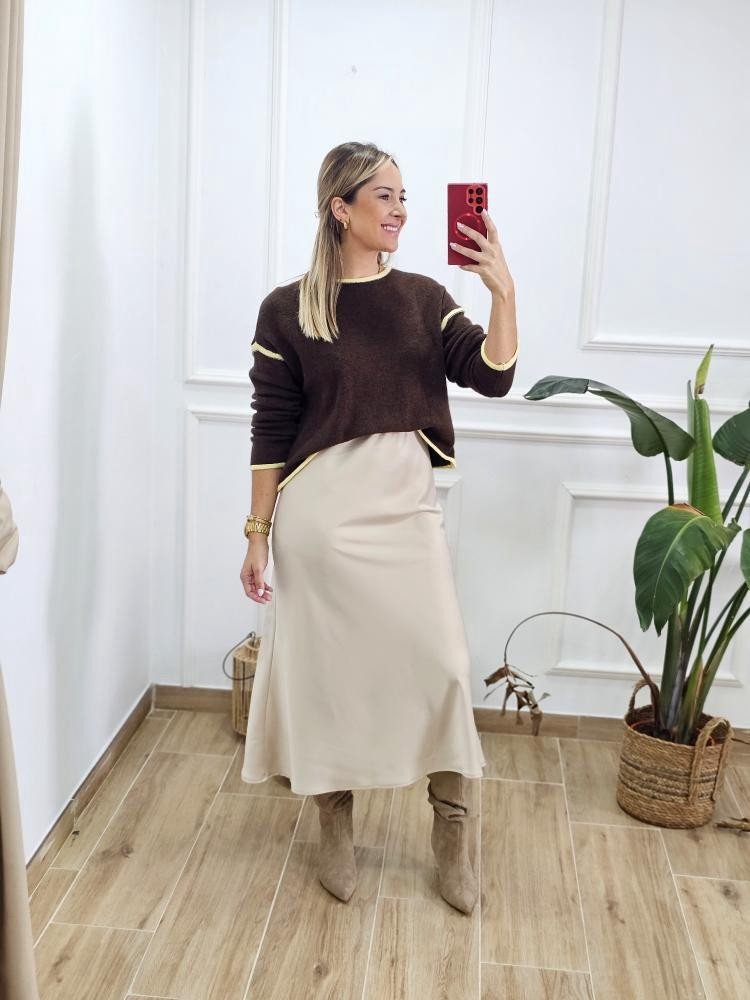 Jersey de punto de manga baja y cuello redondo. Detalle de líneas en color amarillo en varios puntos de la prenda. Talla única y único color.