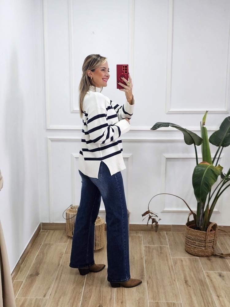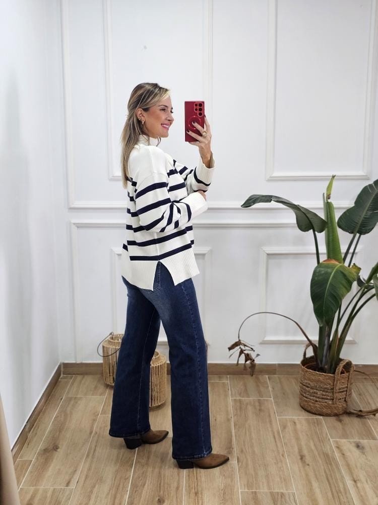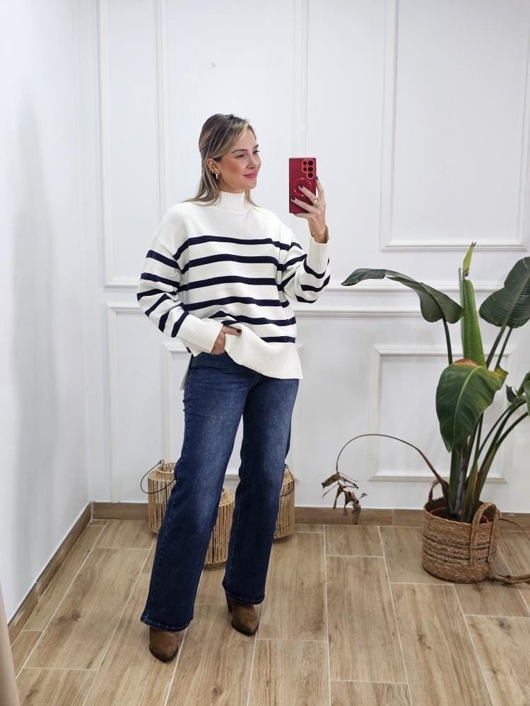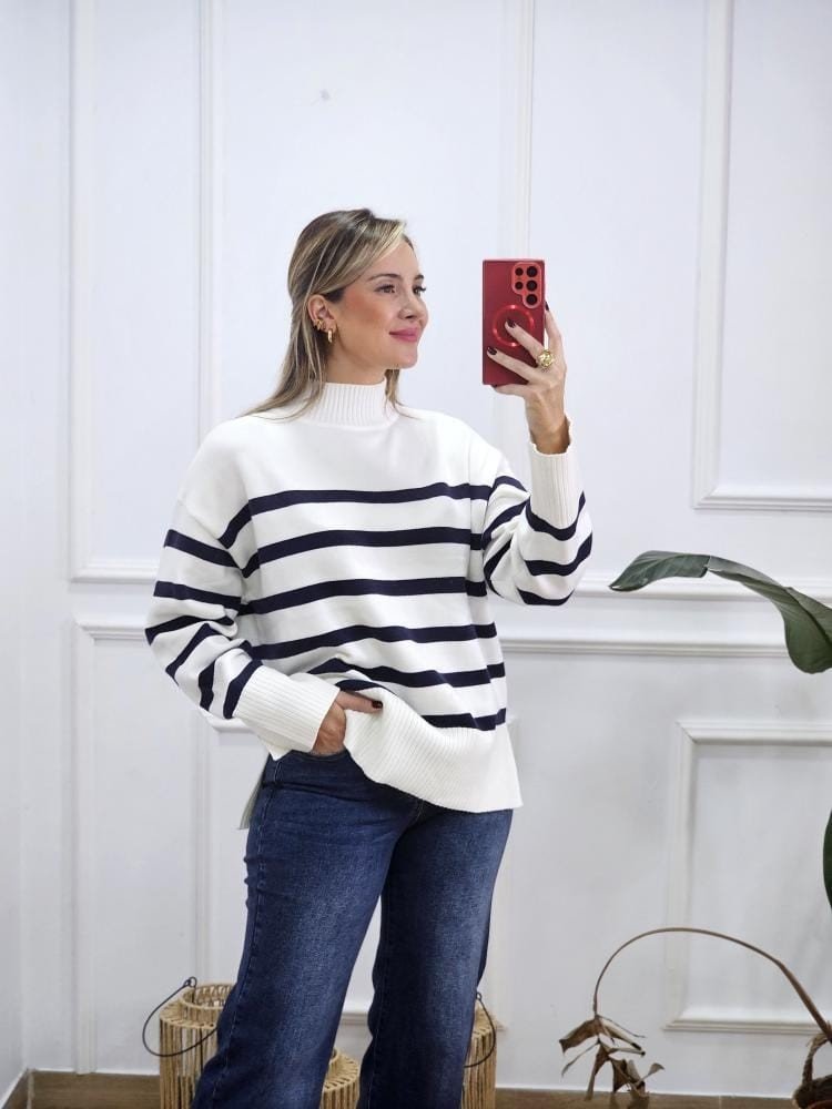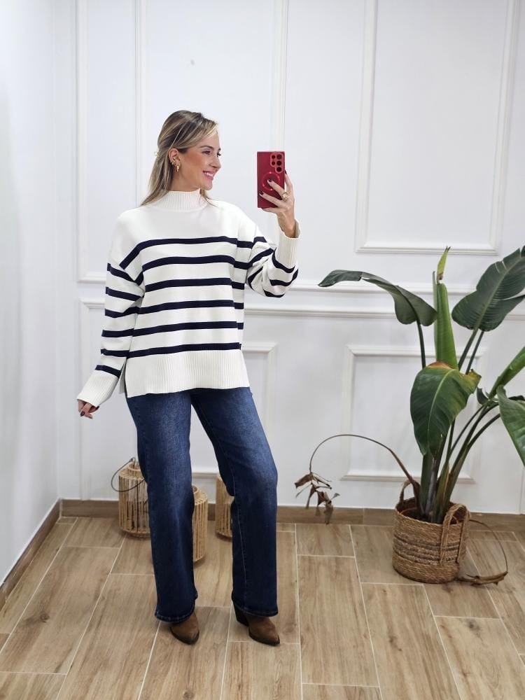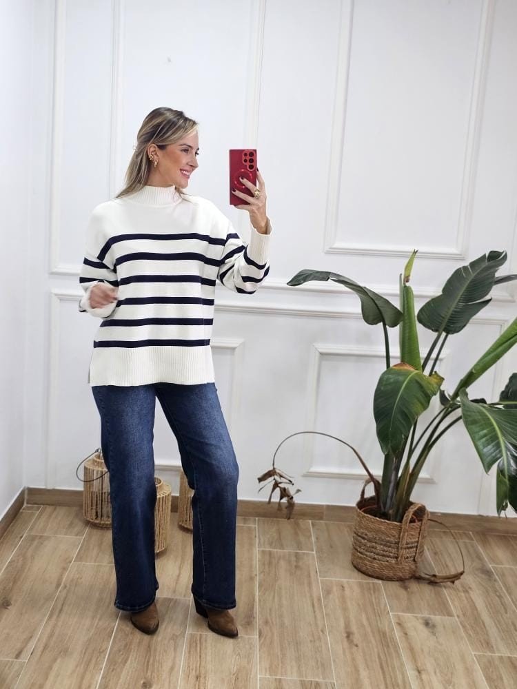 Jersey en tejido de punto corte over size. Contiene cuello vuelto. Detalle de estampado en líneas horizontales azul marino. Talla única y único color.