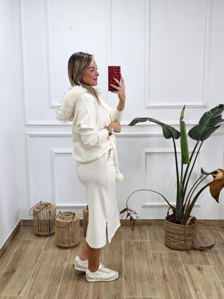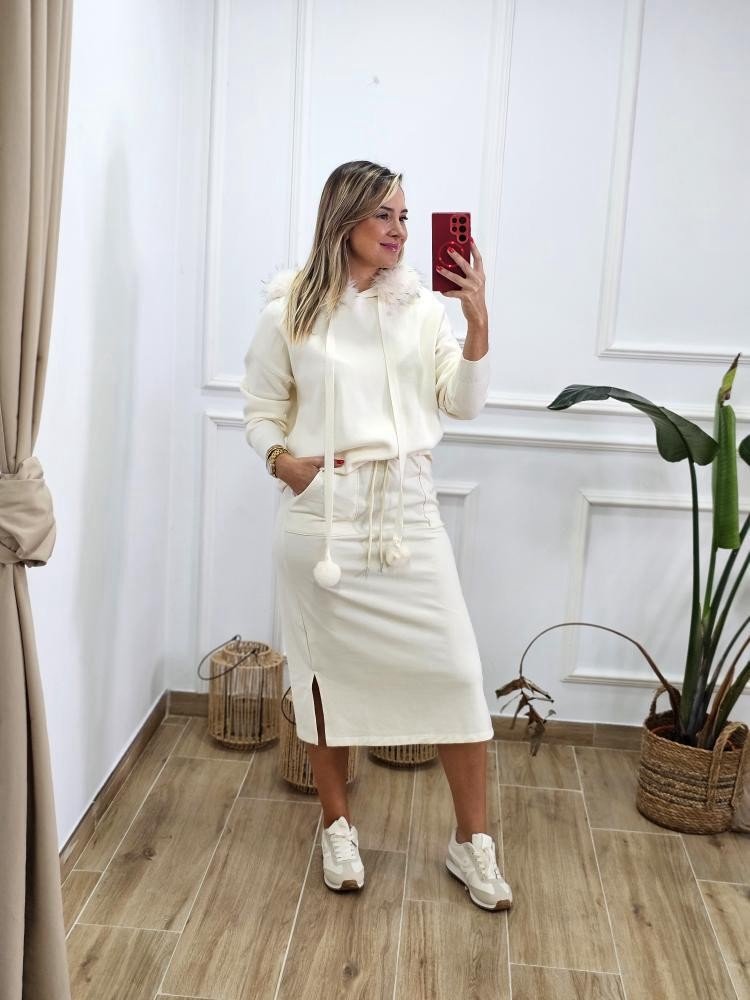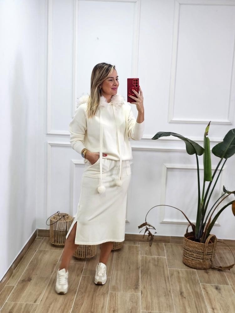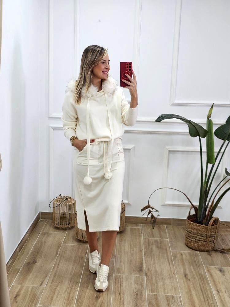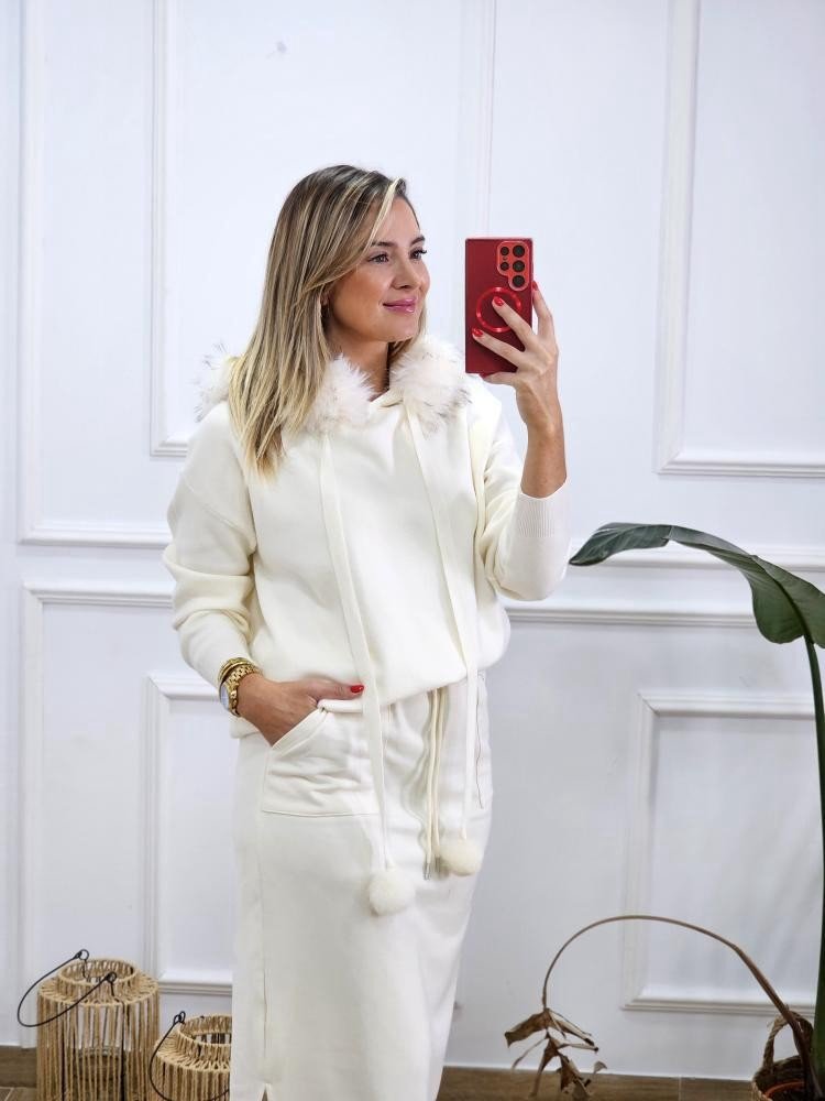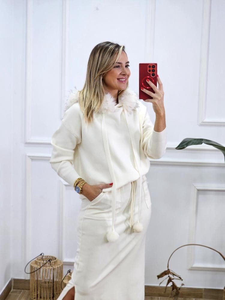 Sudadera con detalle de capucha (contiene detalle de pelo extraíble) y detalle de cordón ancho con terminación en pompón. Manga baja con pretina fina en el puño y pretina en la zona baja de la prenda. Talla única y único color.