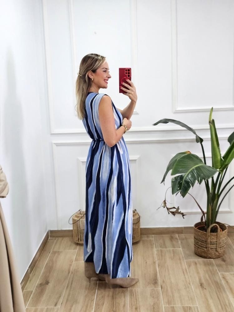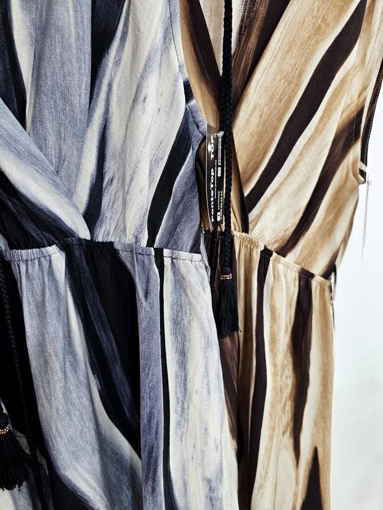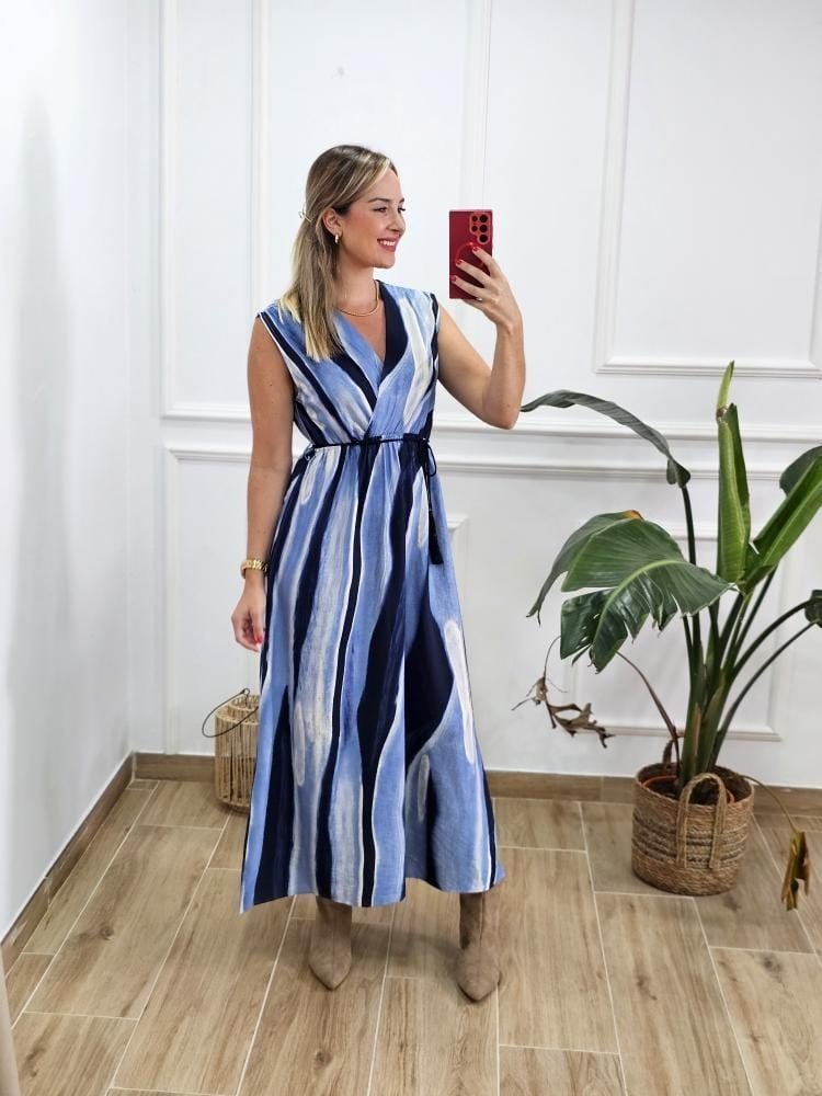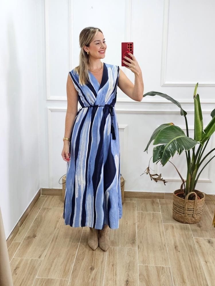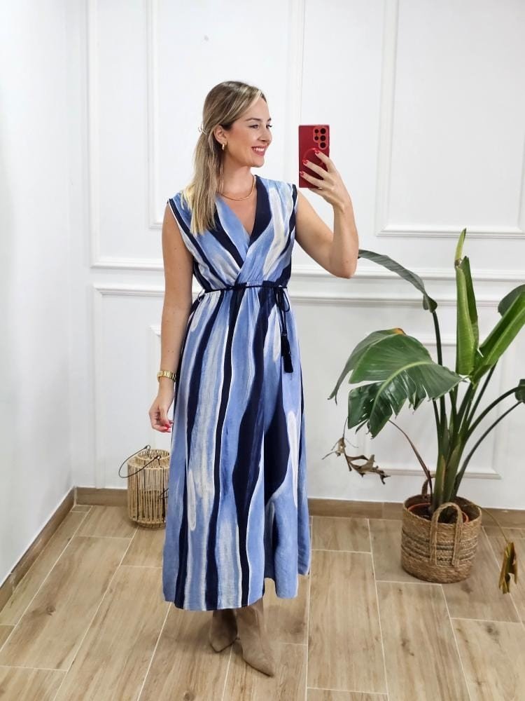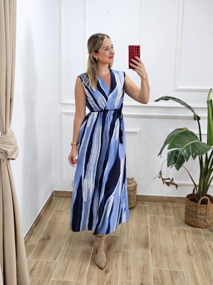 Vestido en tejido fluido. Manga recortada, escote cruzado, contiene elástico en la zona baja del pecho y detalle de lazada fina para ajustar. Por tallas y varios colores.