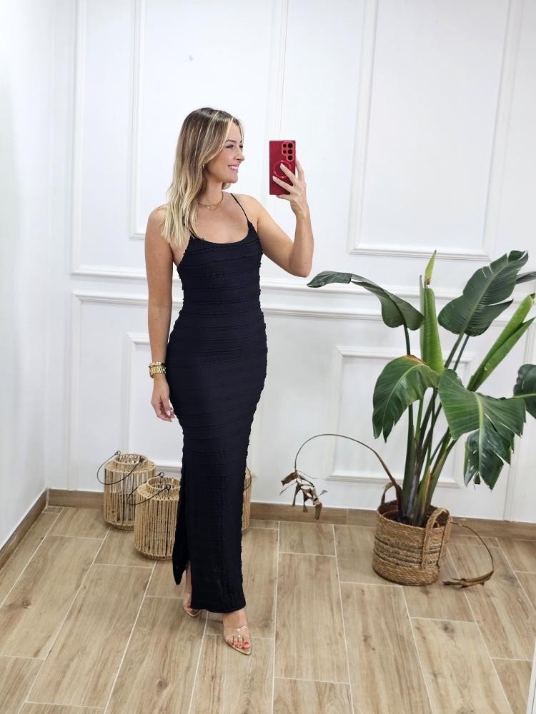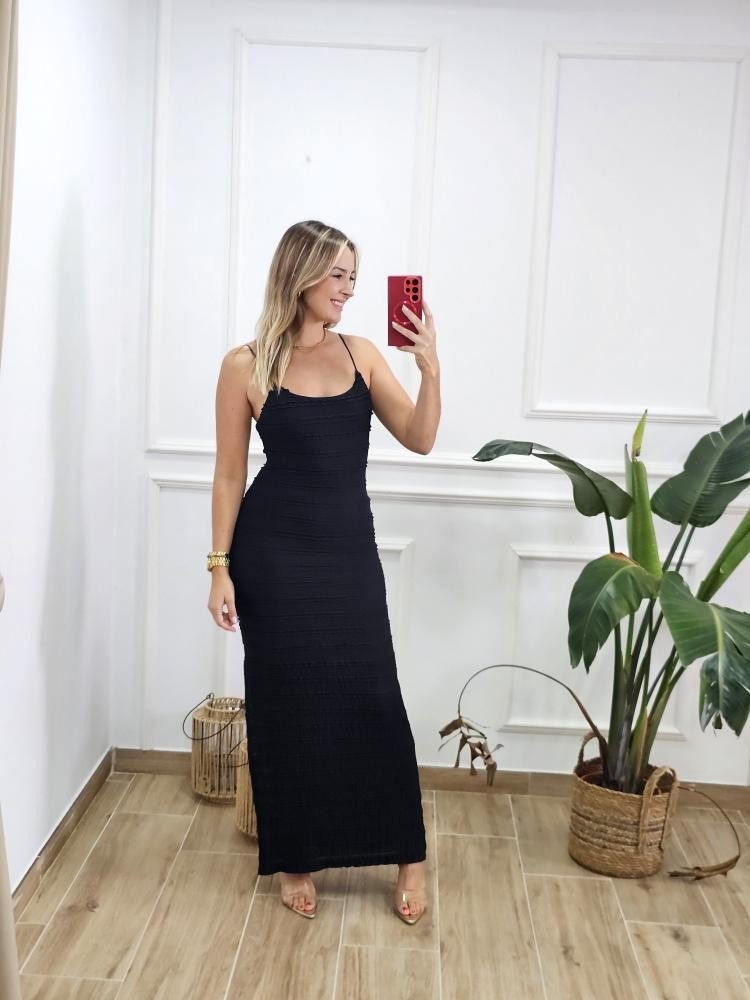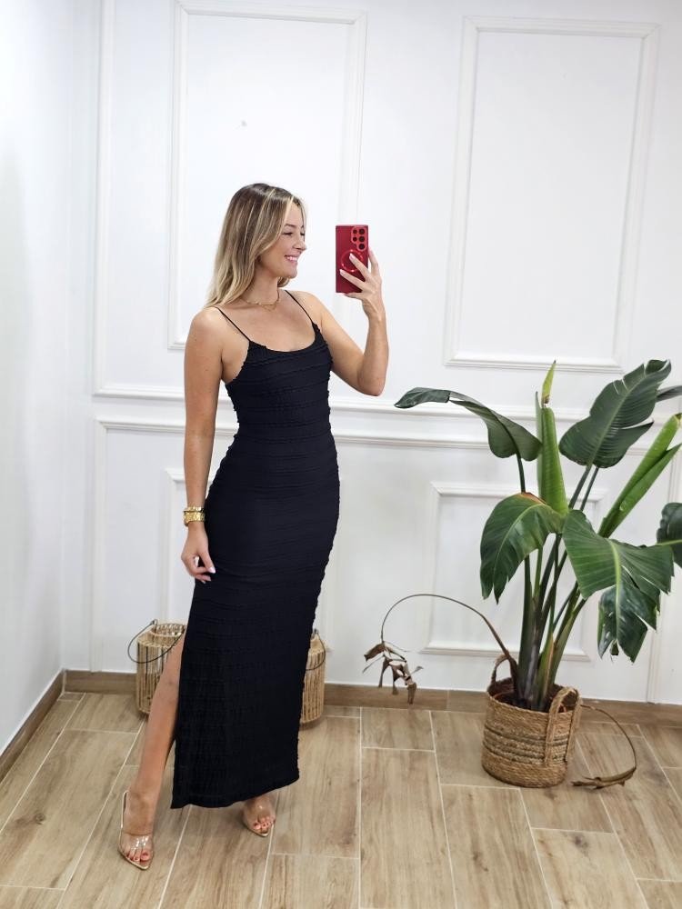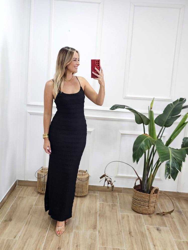 Vestido bajo en tejido elástico. Contiene escote redondo. Asilla fina elástica. Contiene forro interior. Detalle abertura en uno de los laterales. Talla única y único color.