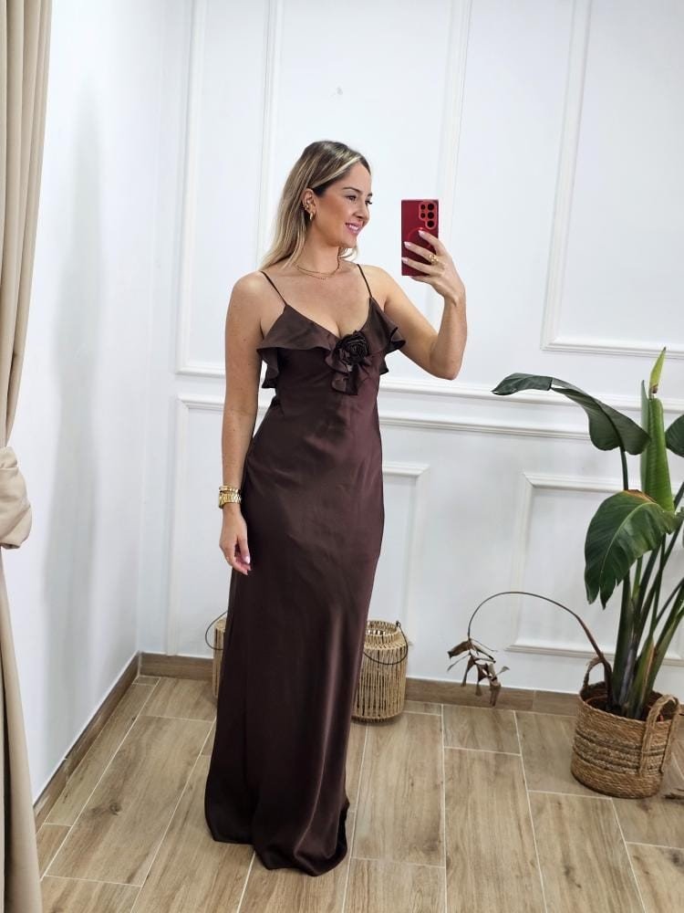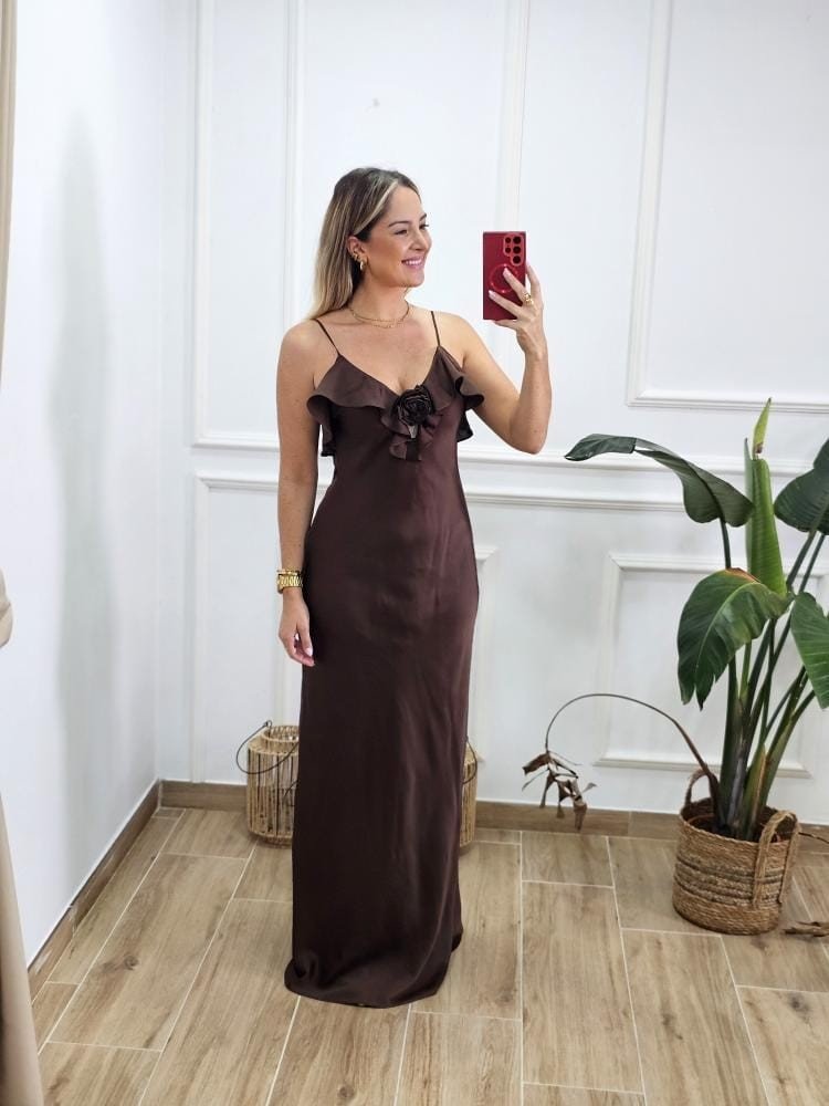 Vestido bajo en tejido satinado. Contiene escote en pico. Asilla fina ajustable. Detalle de flor con volante en la zona del pecho. Cremallera en uno de los laterales. Forro interior. Por tallas y único color.