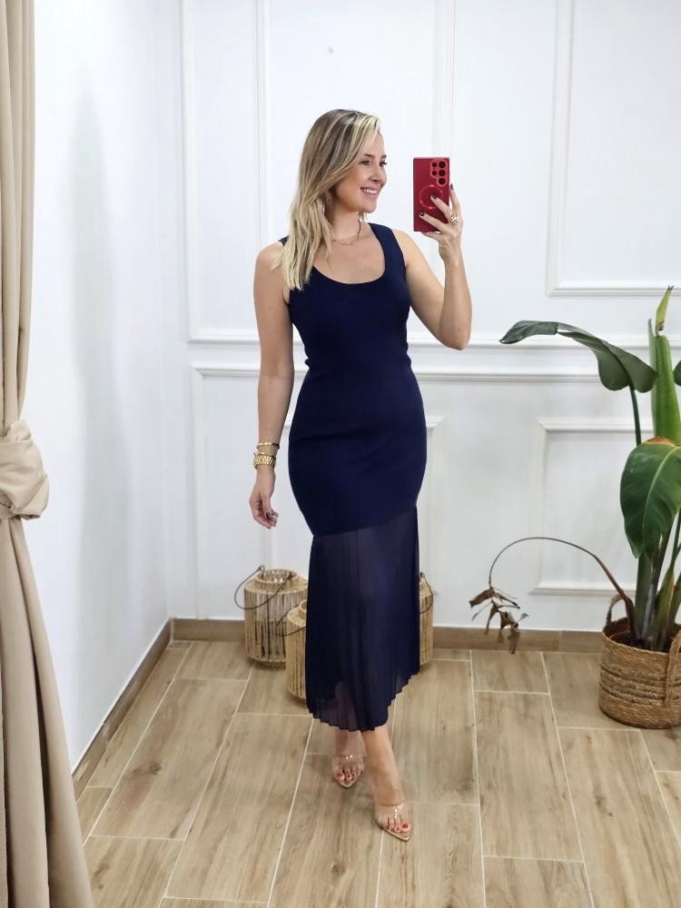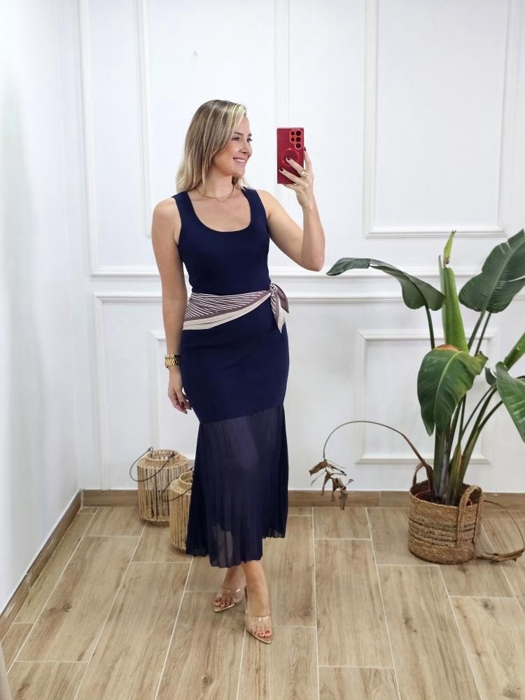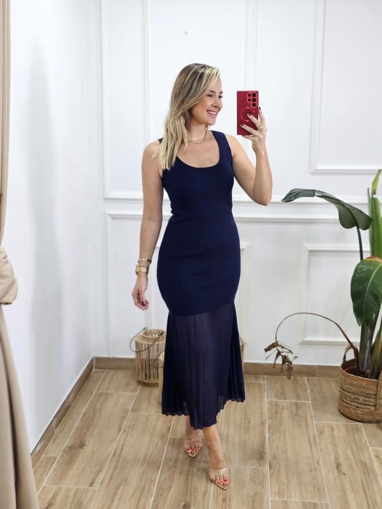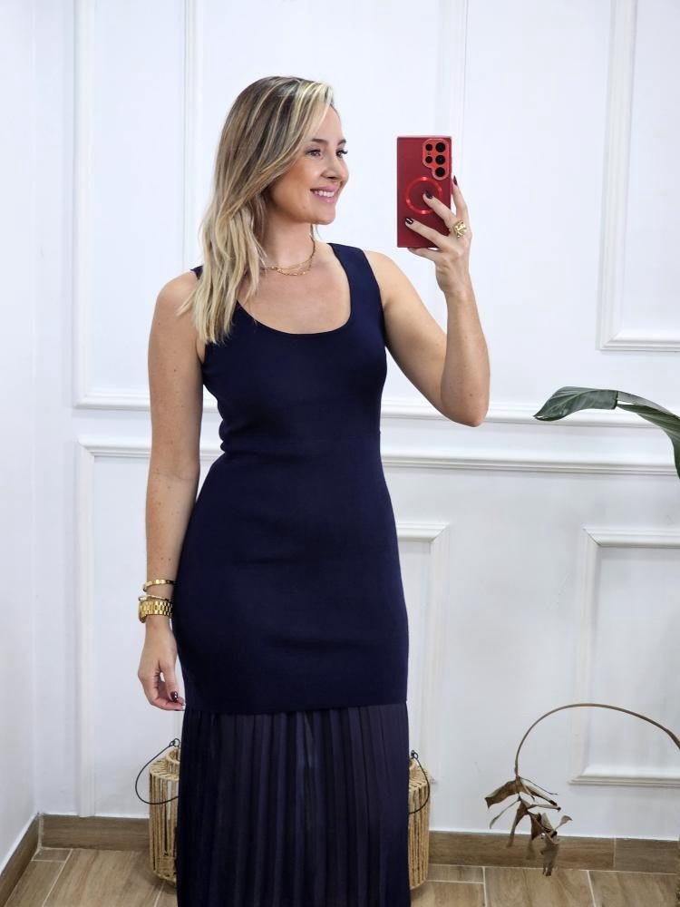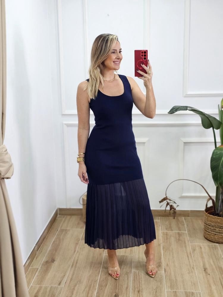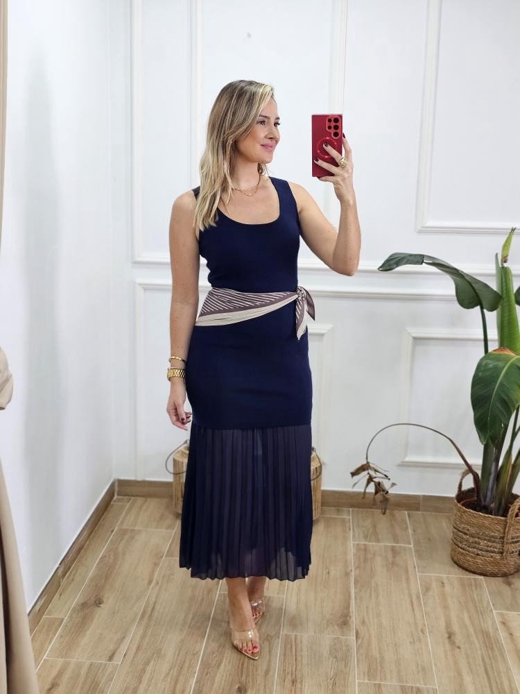 Vestido combinado en tejido de punto con gasa en la parte baja. Contiene asilla ancha. Detalle de escote redondo. Bajo entablillado. Por tallas y único color.