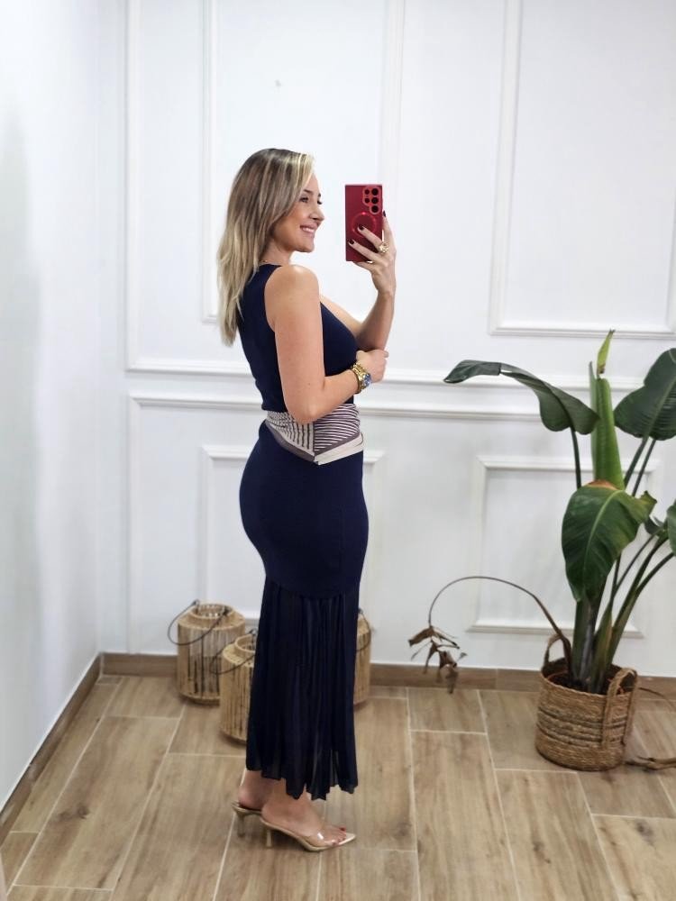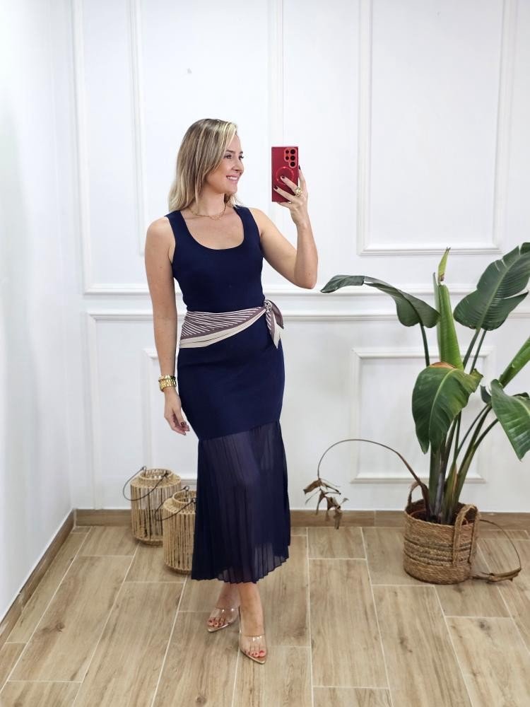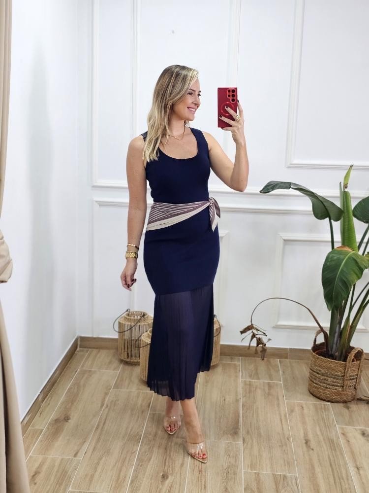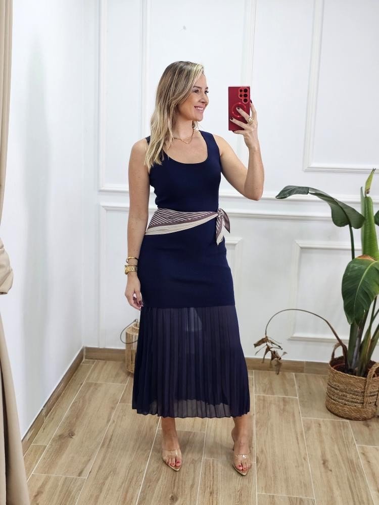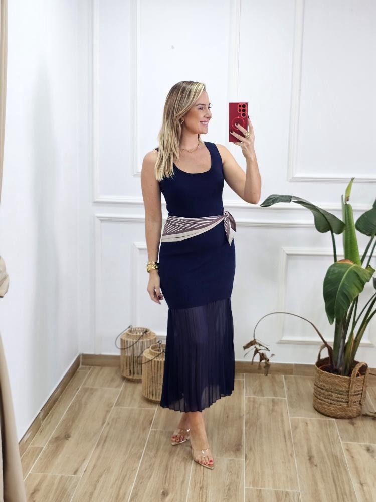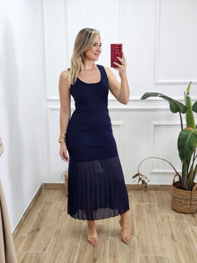 Vestido combinado en tejido de punto con gasa en la parte baja. Contiene asilla ancha. Detalle de escote redondo. Bajo entablillado. Por tallas y único color.