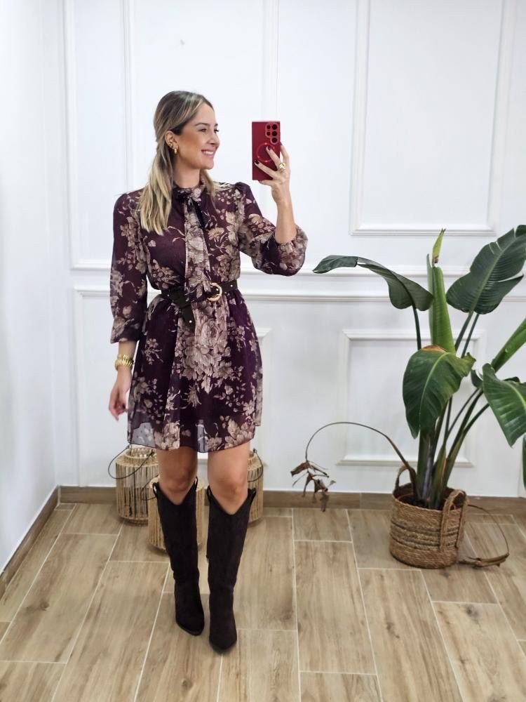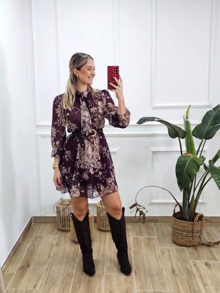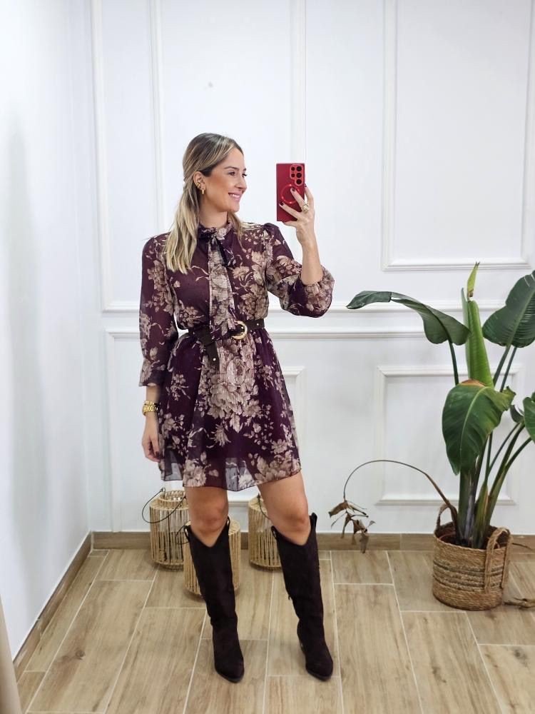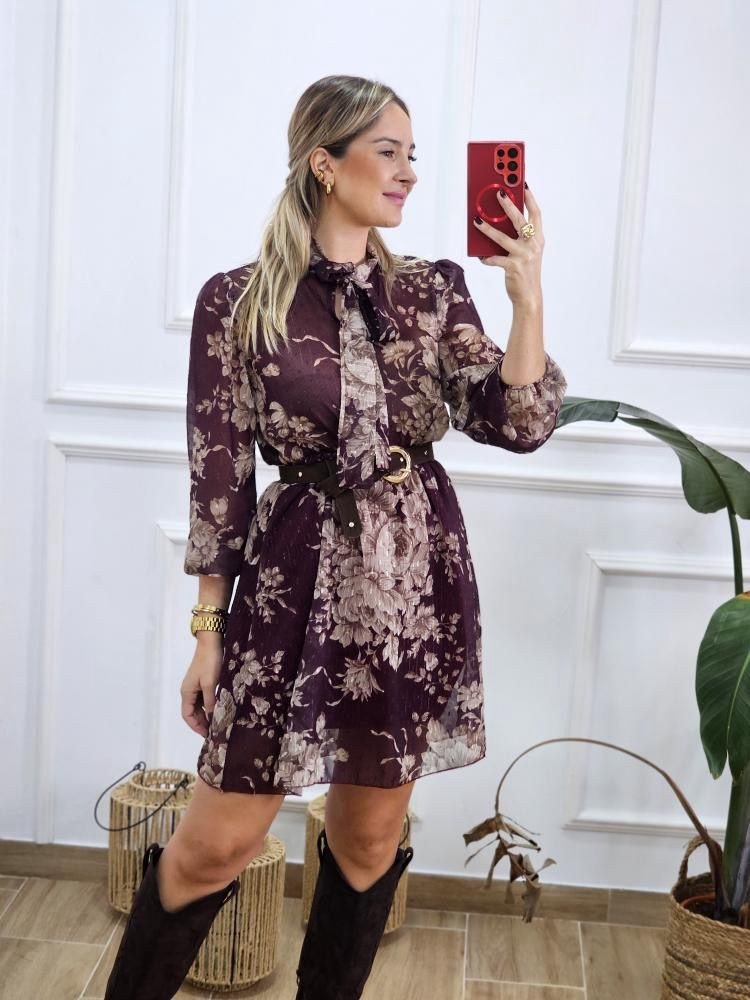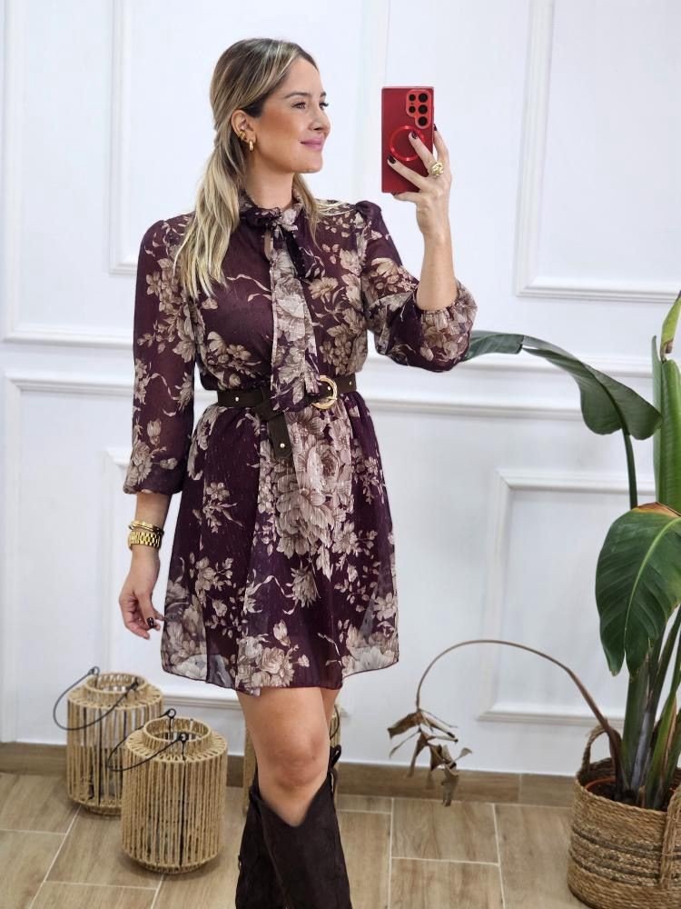 Vestido corto en tejido de gasa. Contiene manga larga. Detalle de cuello con lazada en la zona central para ajustar. Elástico en la zona de la cintura. Bajo con forro interior. Talla única y varios colores.