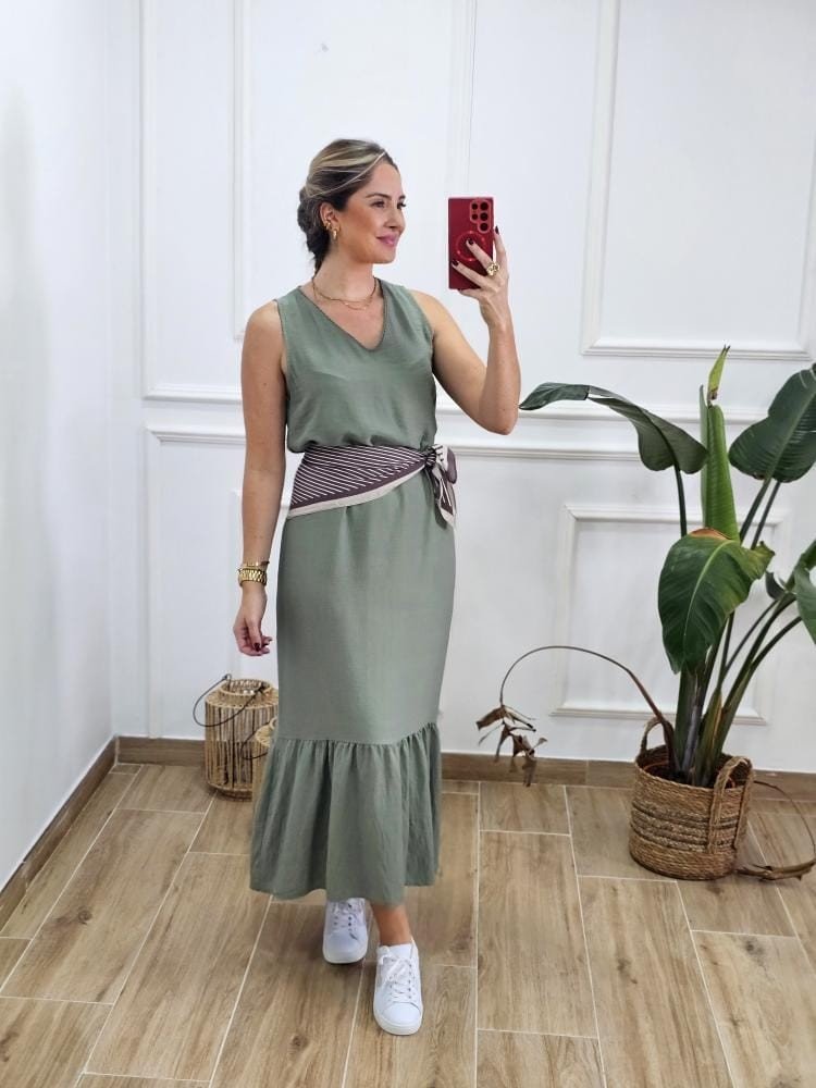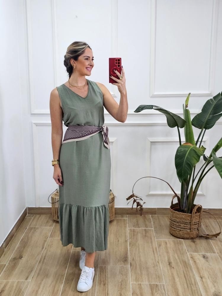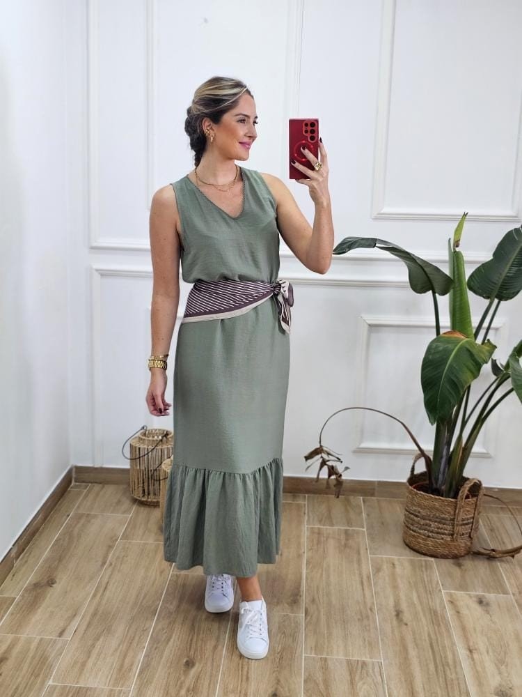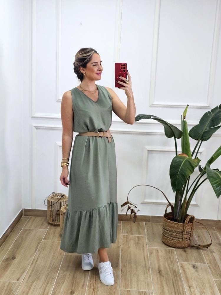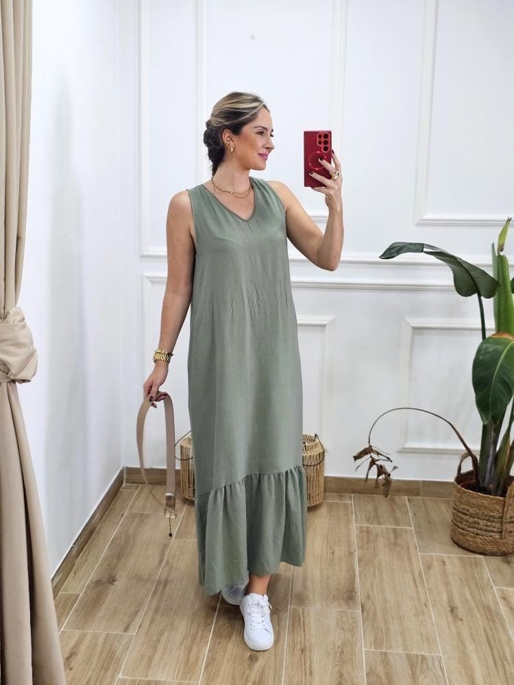 Vestido bajo en tejido ligero. Contiene asilla ancha. Detalle de escote en pico. Bajo con pequeño volante. Talla única y único color.