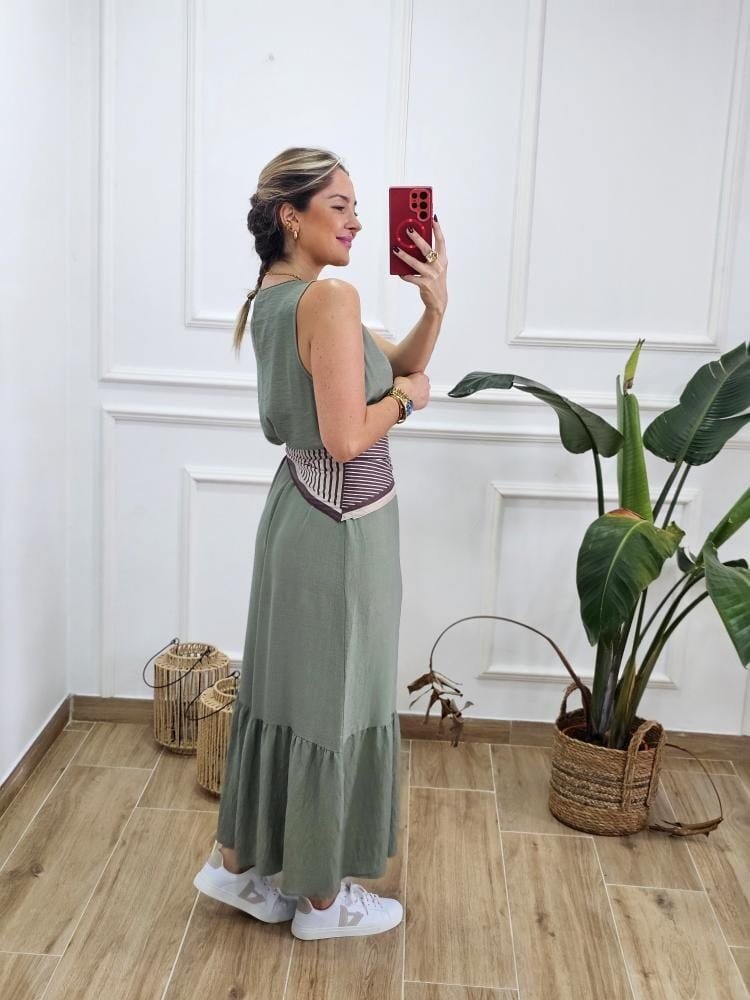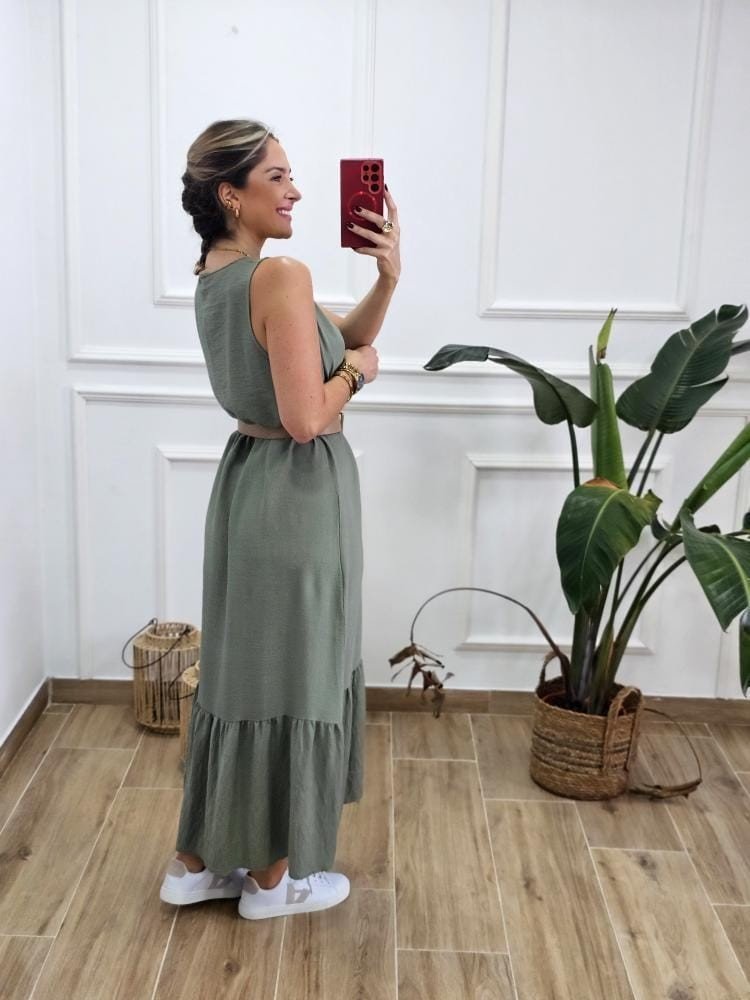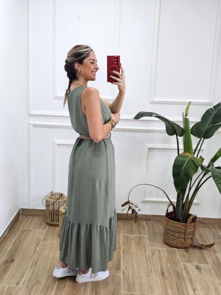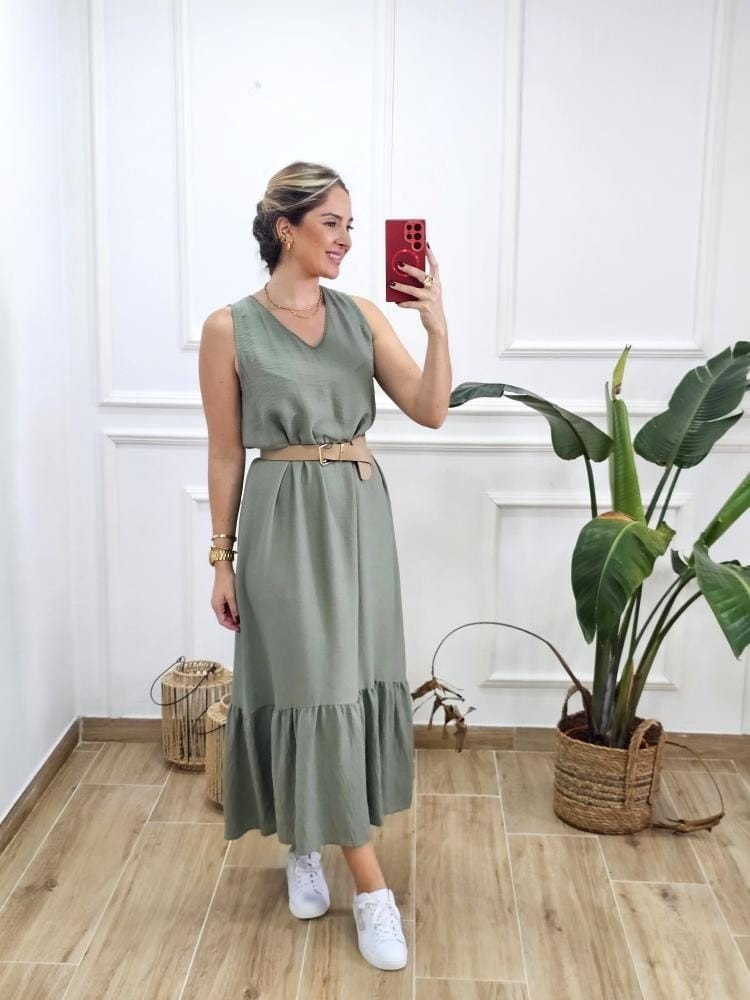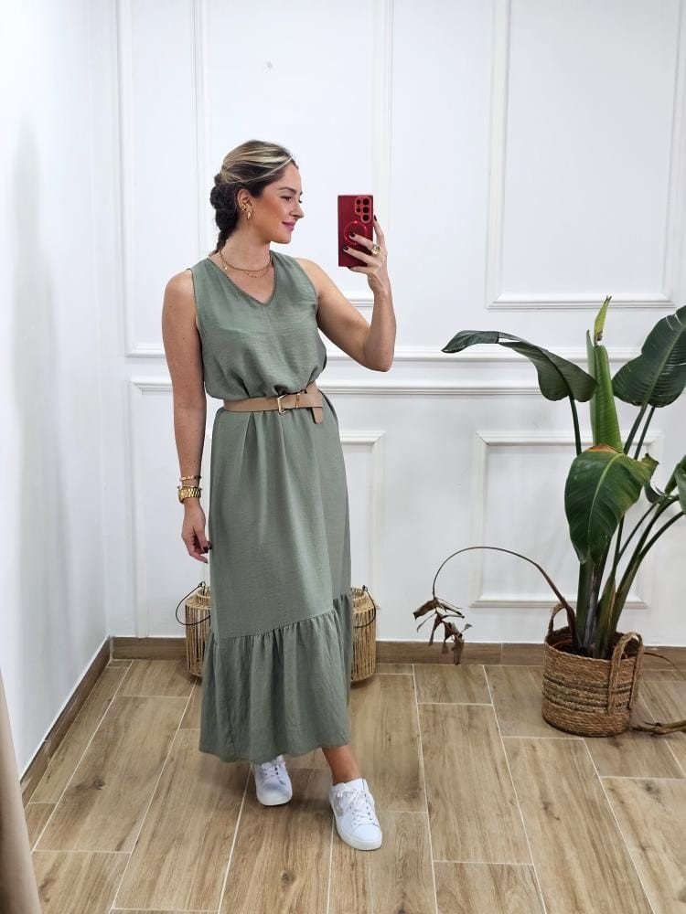 Vestido bajo en tejido ligero. Contiene asilla ancha. Detalle de escote en pico. Bajo con pequeño volante. Talla única y único color.