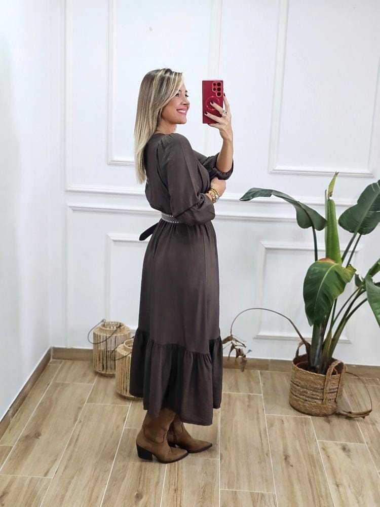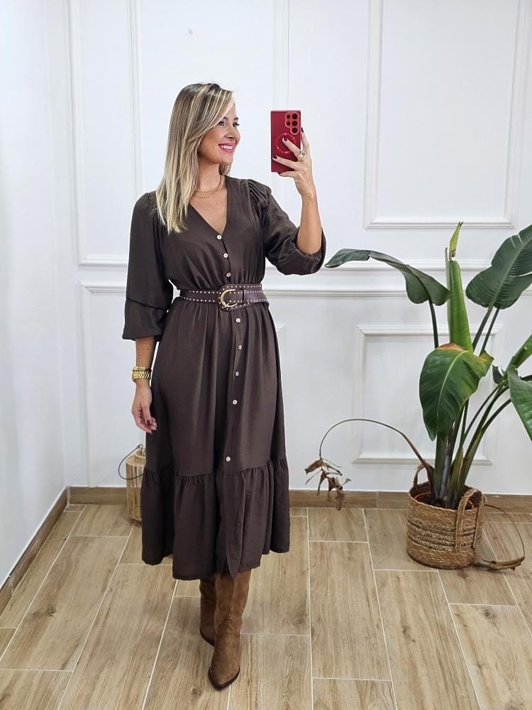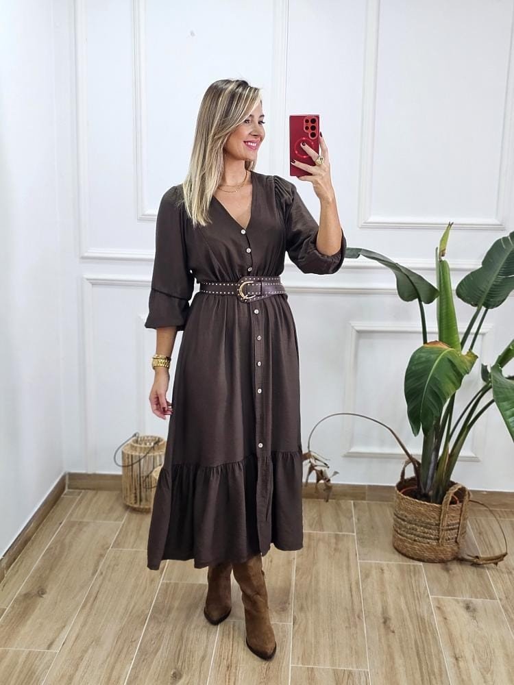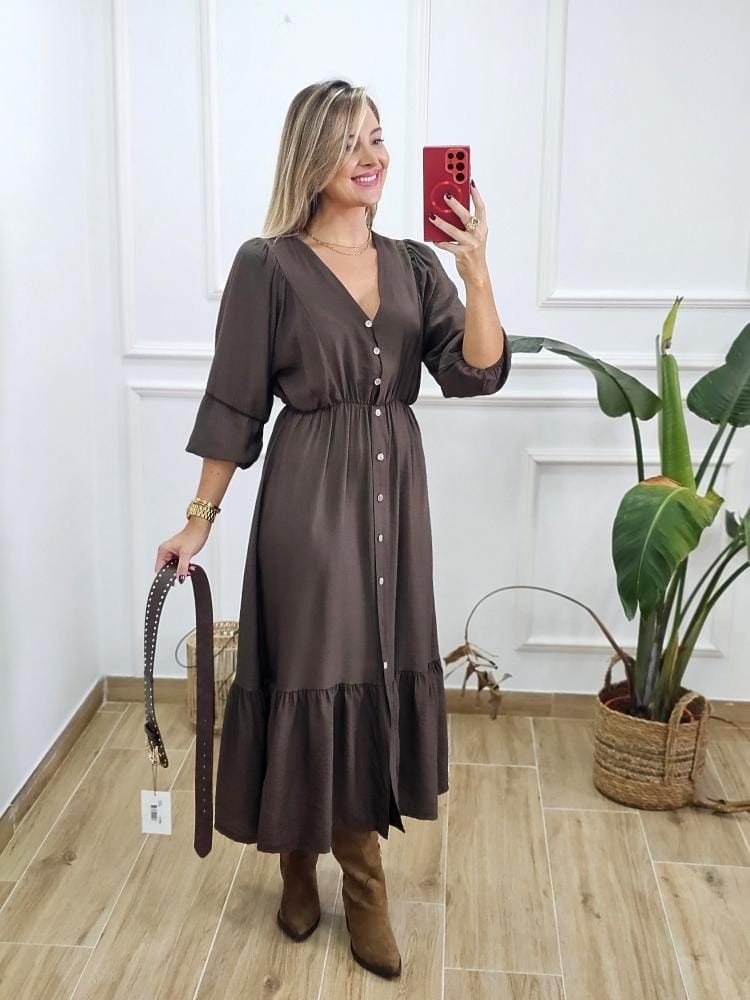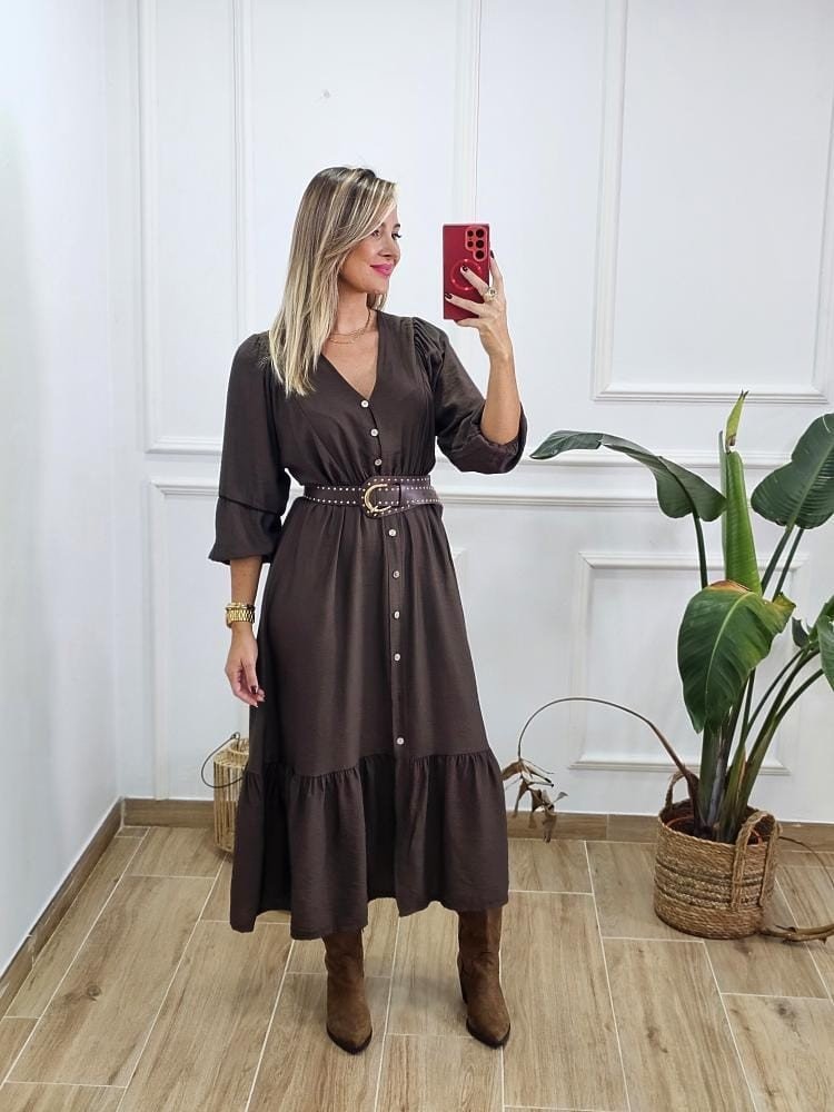 Vestido bajo de tejido ligero. Escote en pico con abotonadura en la zona central. Manga baja con elástico en el puño. Volante en el bajo del vestido. Elástico en la zona de la cintura. Talla única y único color.