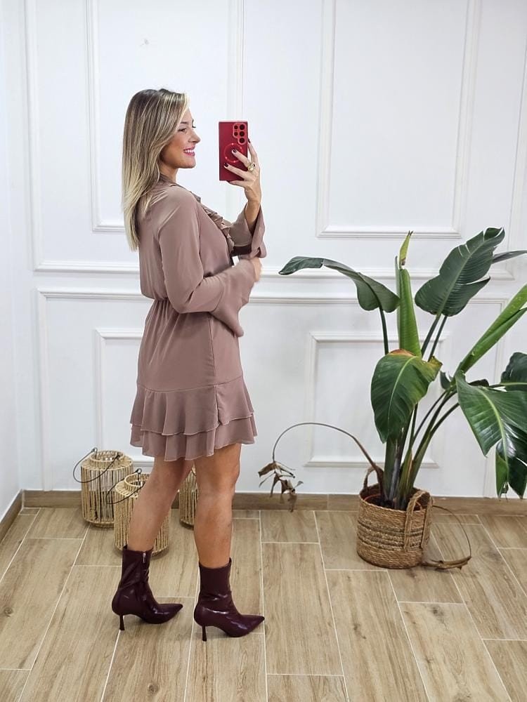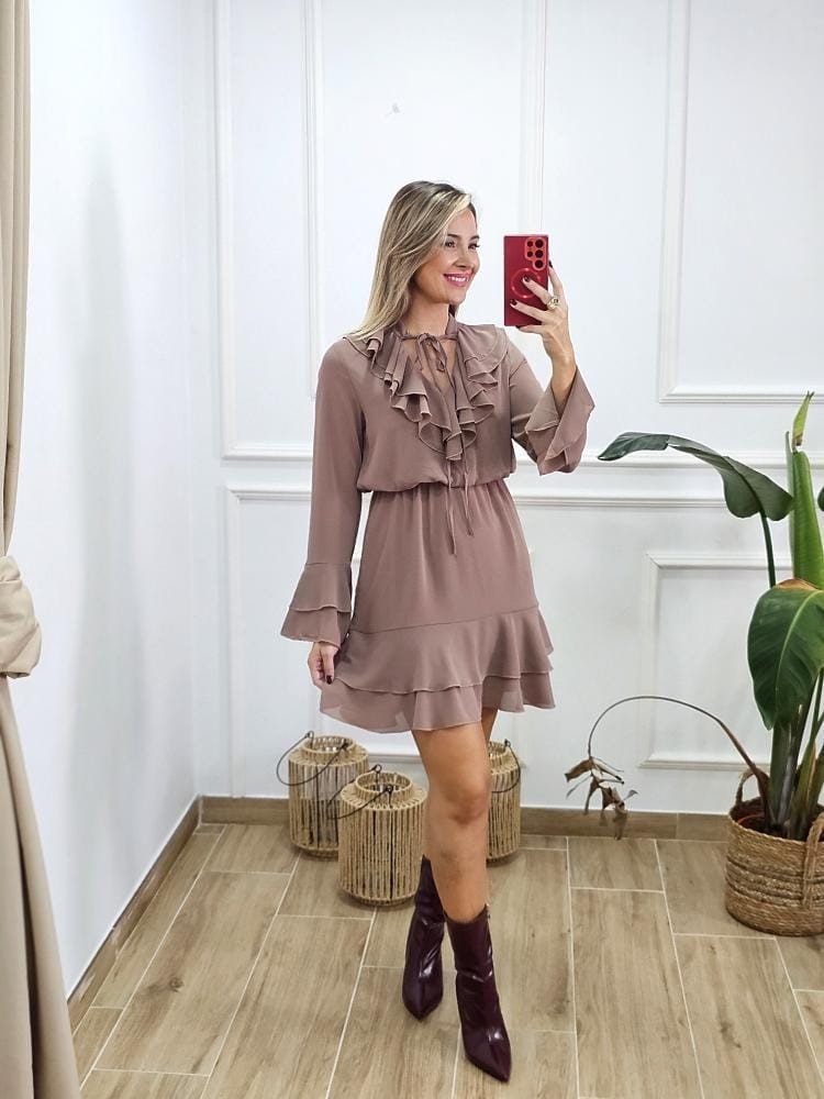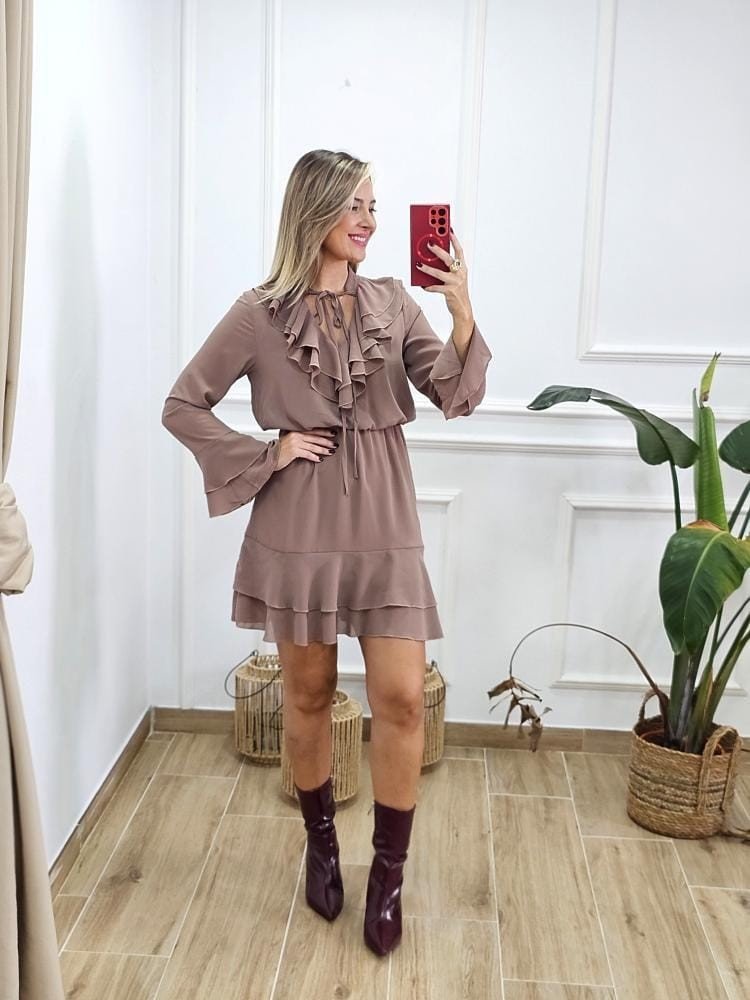 Vestido corto estilo boho en tejido fluido. Contiene manga con pequeños volantes. Escote en pico con pequeño cuello mao con lazada en la zona del cuello para ajustar. Elástico en la zona de la cintura. Contiene forro interior. Por tallas y único color.