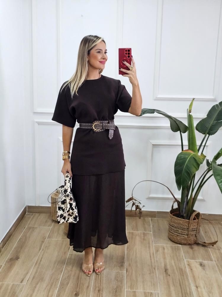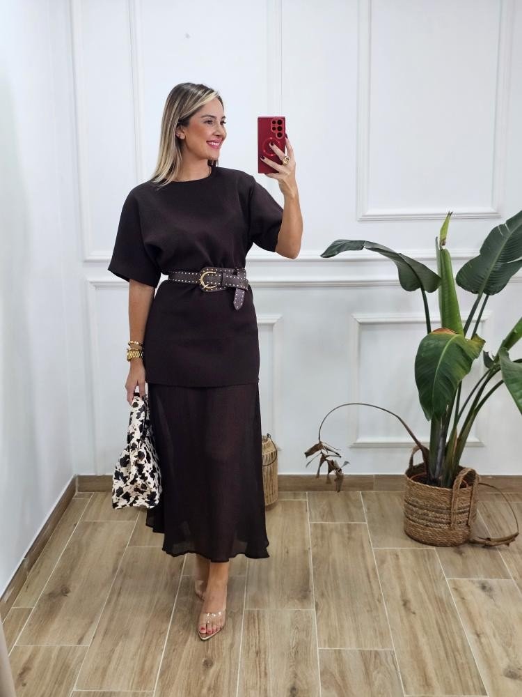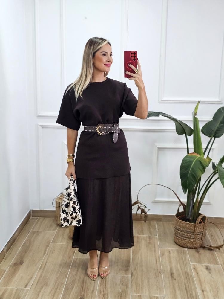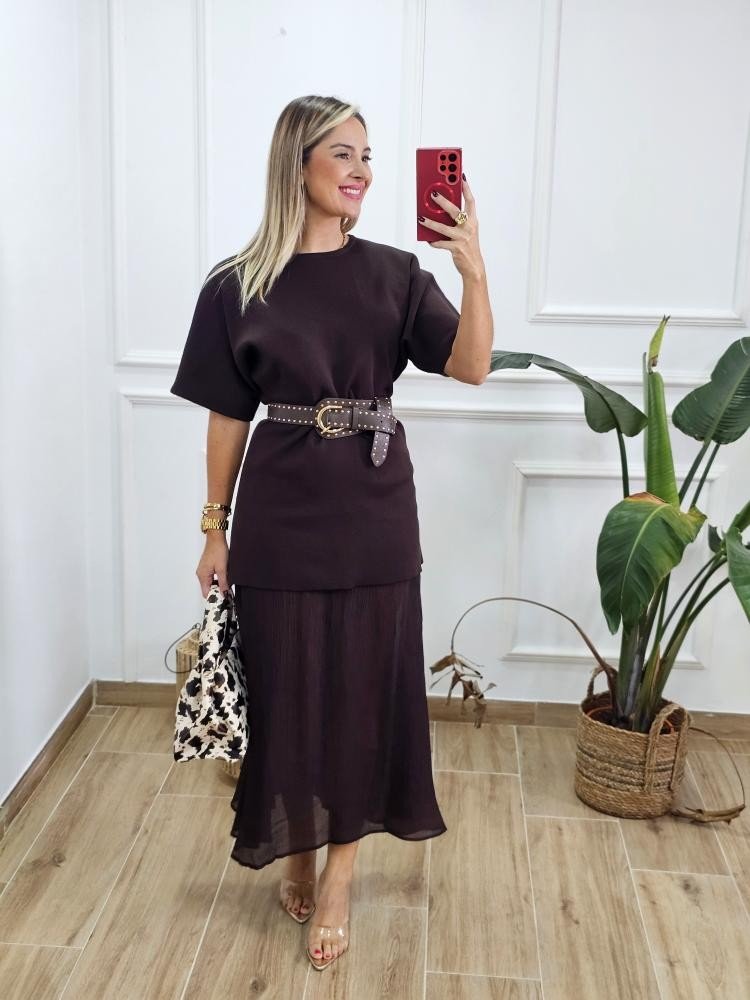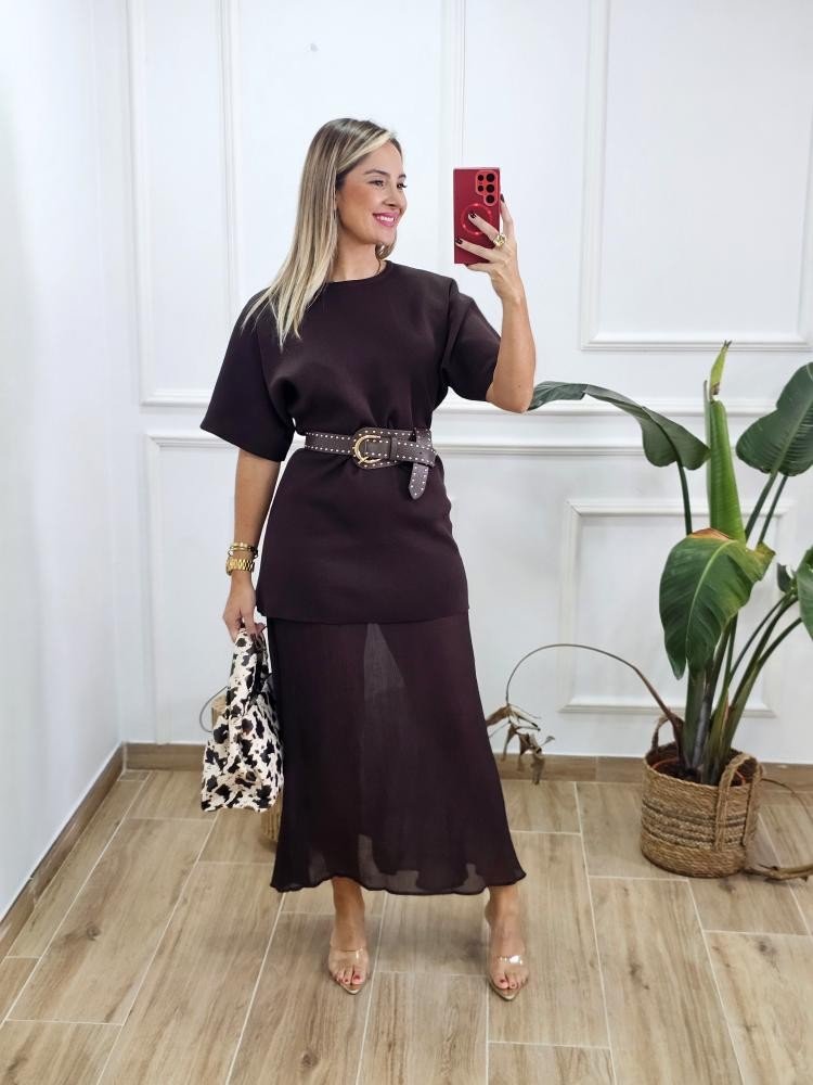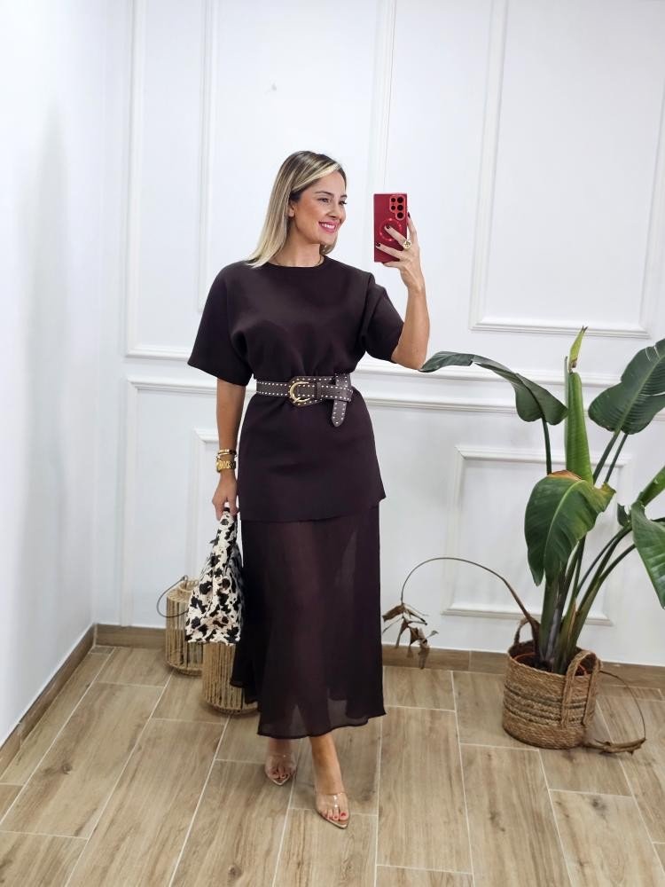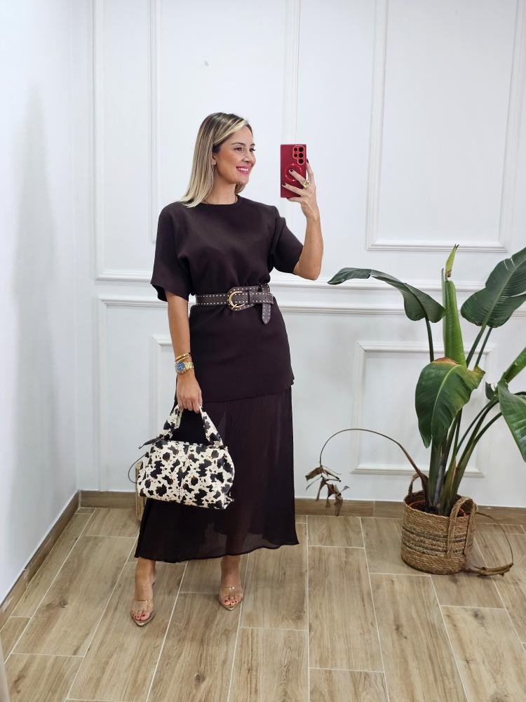 Vestido bajo en tejido de punto combinado con bajo en efecto fluido. Contiene manga corta estilo japonesa. Cuello redondo. Bajo en tejido fluido. Talla única y único color.