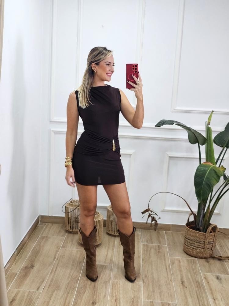 Vestido corto en tejido de poliéster ligero. Contiene escote cerrado con detalle de abalorios dorado. Falda corte A. Fruncido en uno de los laterales con abalorio dorado. Talla única y único