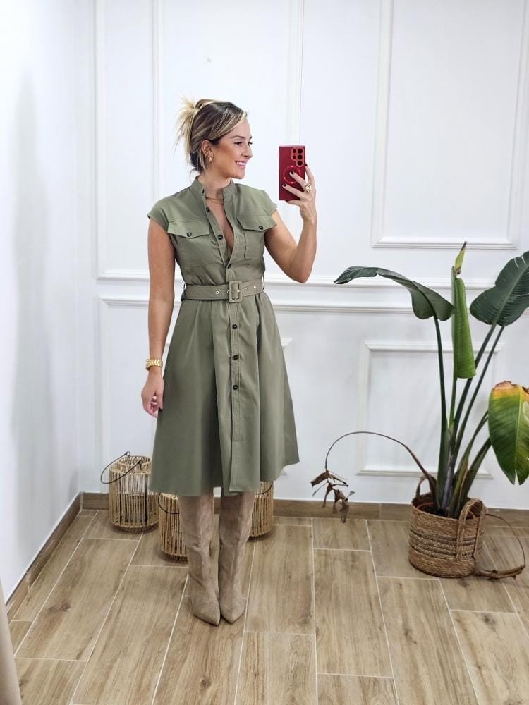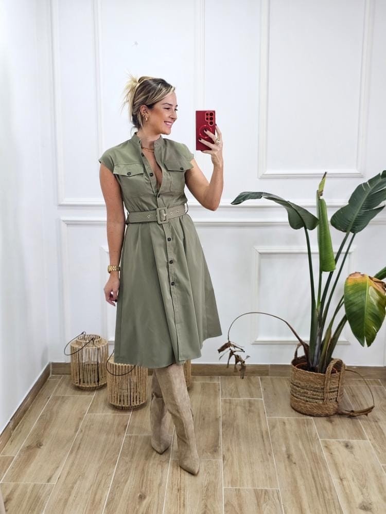Vestido en corte midi. Cuello mao, con detalle de botones en la zona delantera y bolsillos en la zona del pecho. Manga recortada y detalle de pinzas que sale de la zona de la cintura. Incluye cinto. Por tallas y único color.