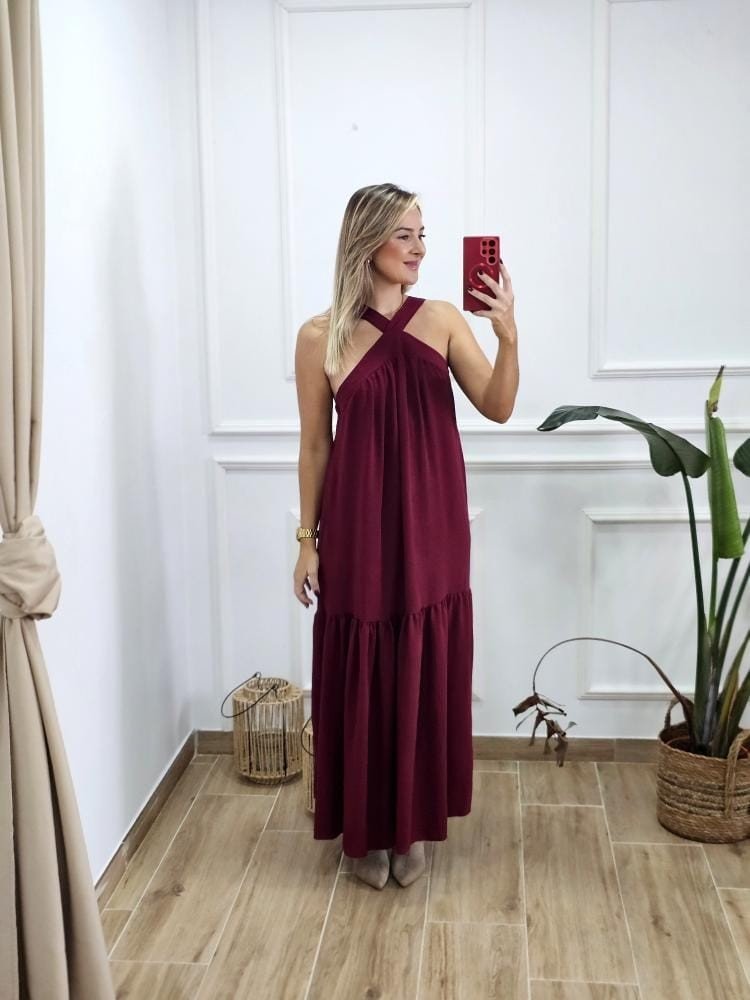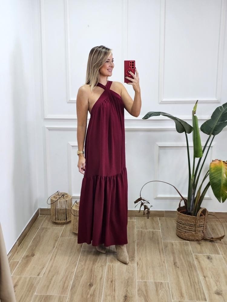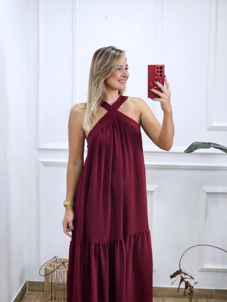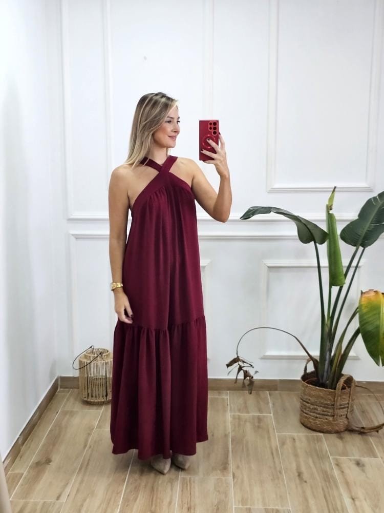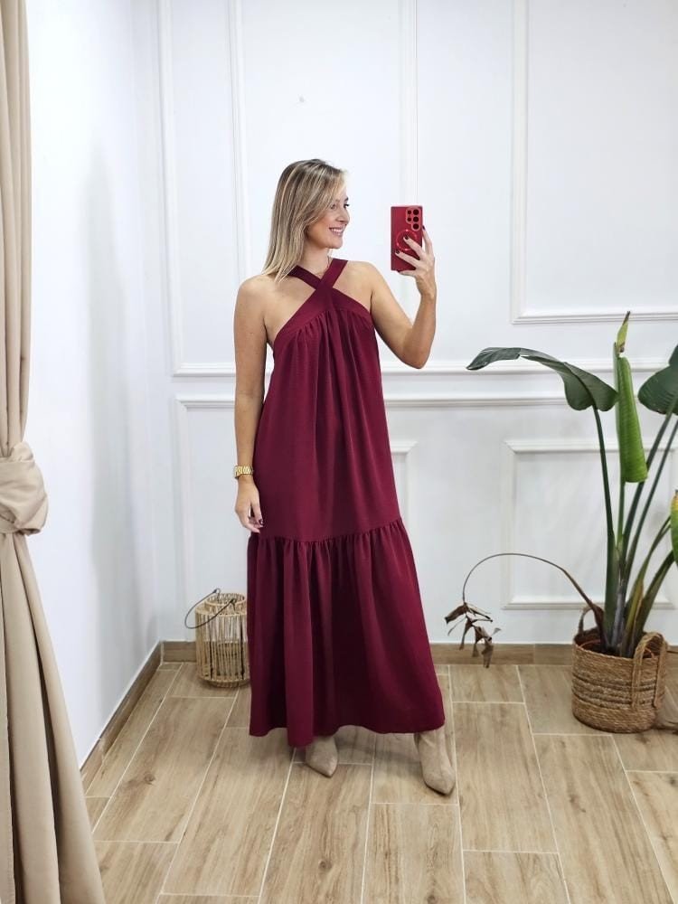 Vestido bajo en tejido fluido. Contiene escote con asilla cruzada. Elástico en la zona trasera. Bajo con detalle de pequeño volante. Talla única y varios colores.