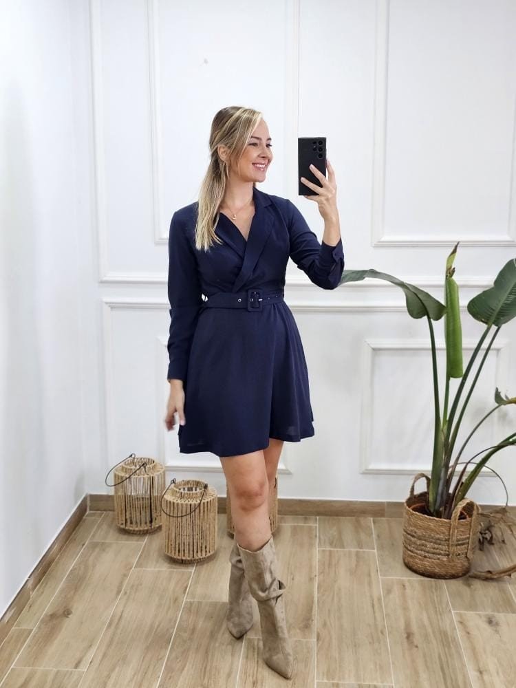 Vestido corto en tejido fluido. Cuello solapado con escote cruzado. Manga baja con botón en el puño, contiene elástico en la zona trasera de la cintura e incluye cinto para ajustar. Por tallas y único color.