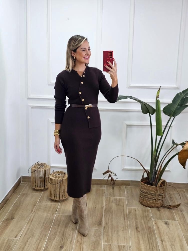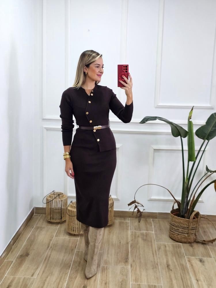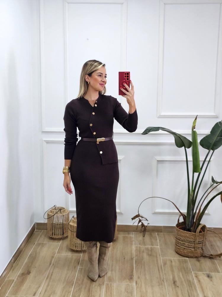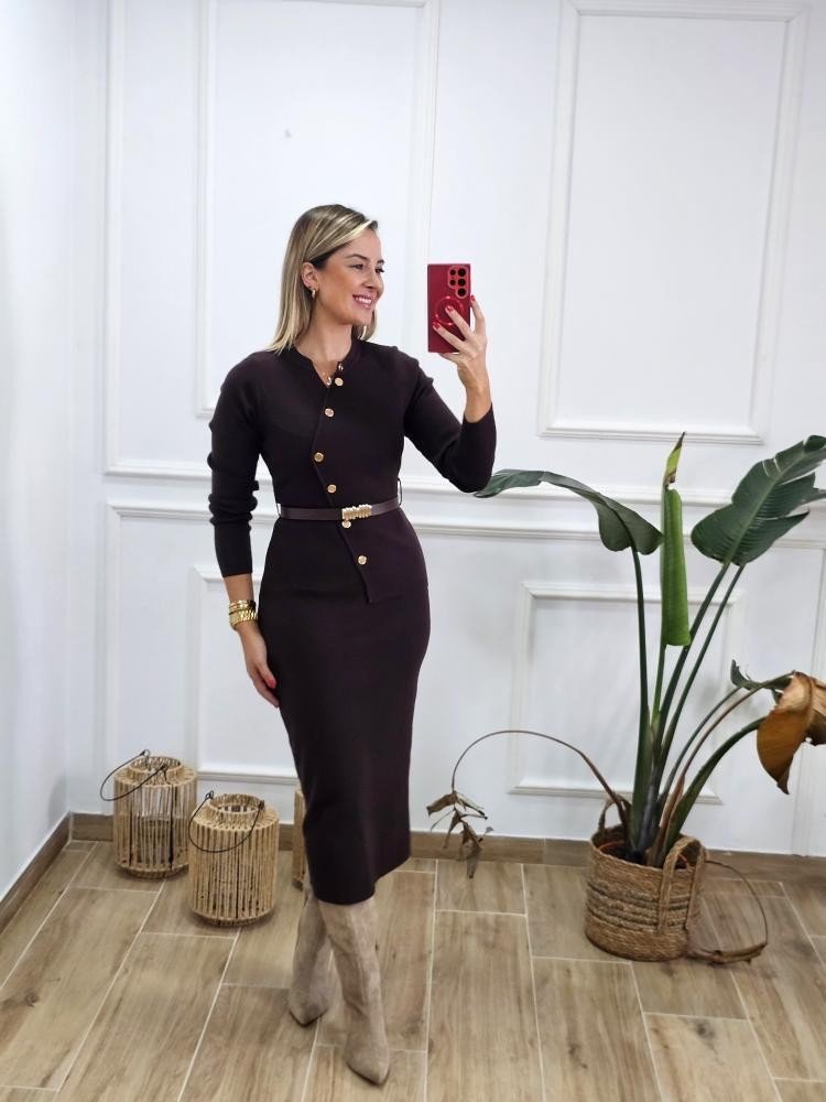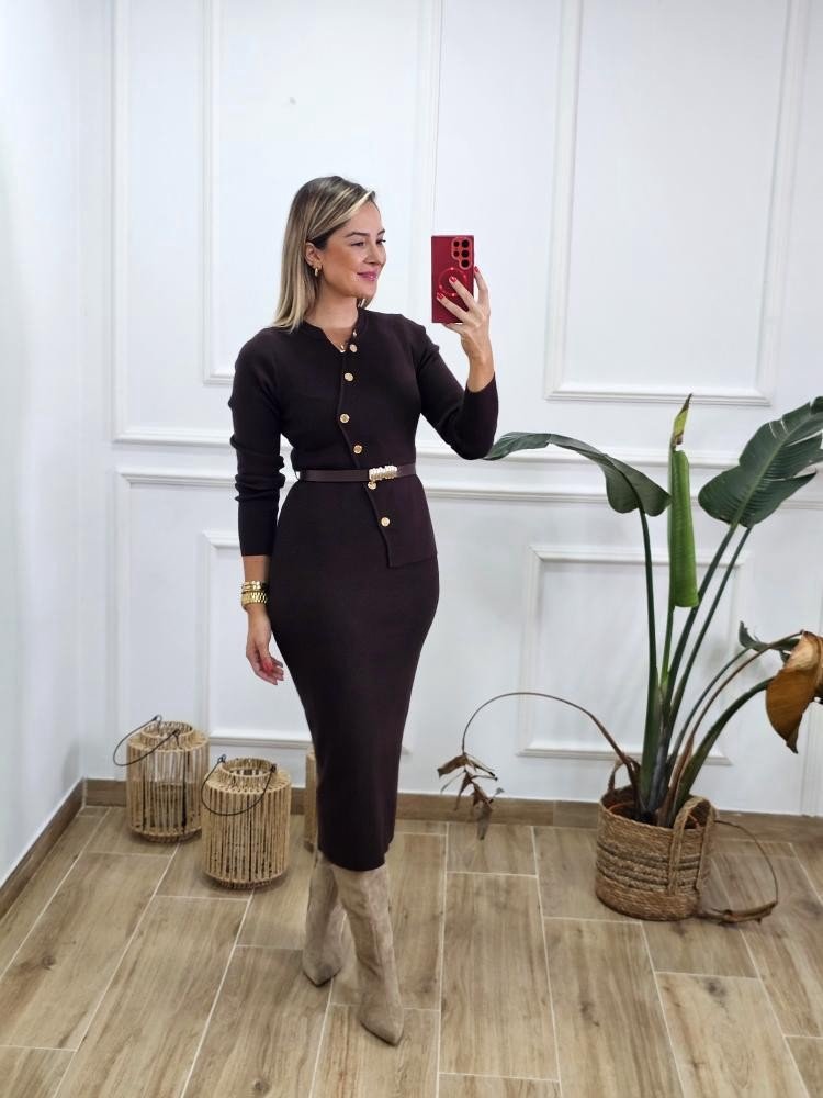 Vestido en tejido de punto fino. Manga baja, cuello redondo y detalle asimétrico con falsos botones dorados en la zona delantera. Incluye cinto extraíble con detalle de hebilla dorada. Talla única y único color.