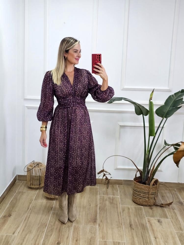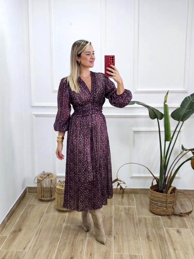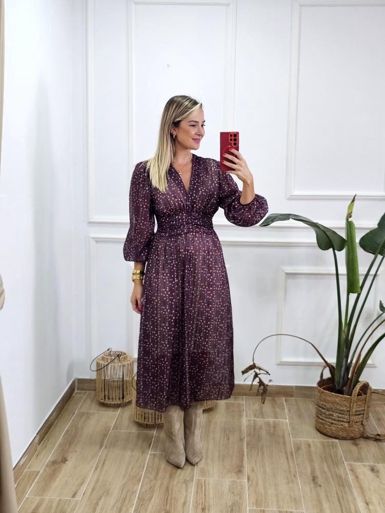 Vestido midi en tejido fluido. Contiene manga baja con elástico en la zona de la empuñadura. Escote cruzado. Fruncido en la zona de la cintura efecto fajín. Nido de abeja en la zona trasera. Forro interior. Talla única y único color.