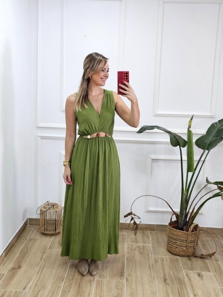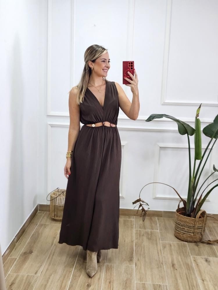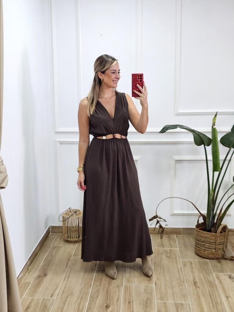 Vestido bajo de tejido con textura. Escote en pico sin mangas. Detalle de abertura con abalorios en la zona de la cintura y elástico en la misma. Talla única y en varios colores.