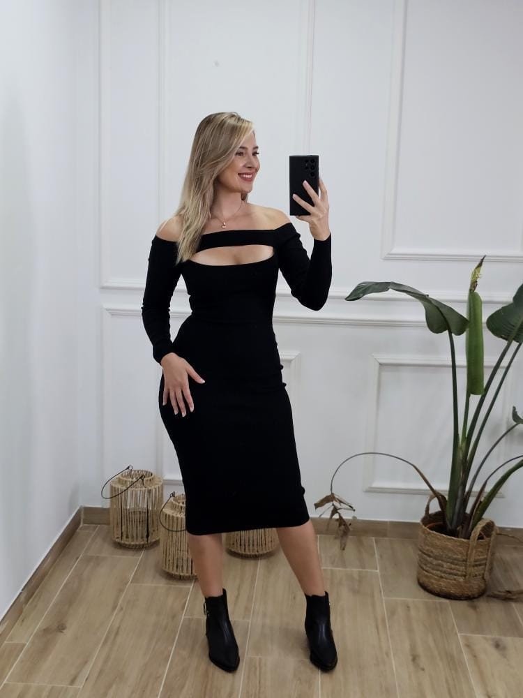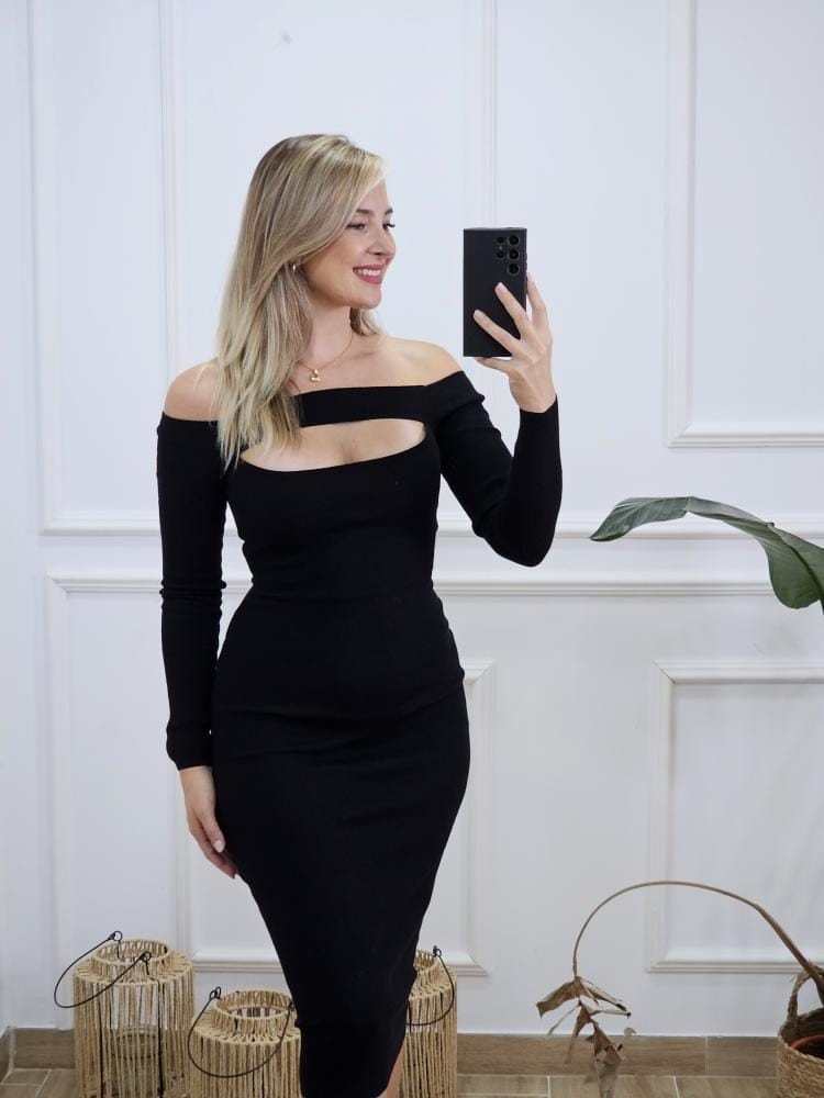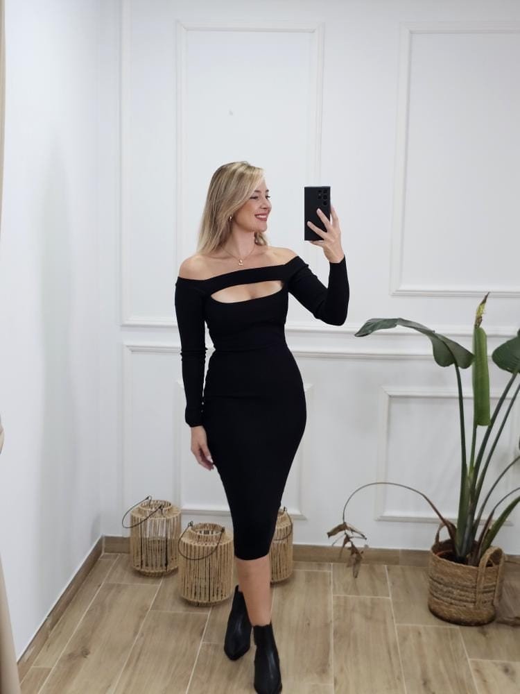 Vestido midi en tejido de punto fino y escote bardot. Manga baja y detalle de abertura en la zona del escote. Talla única y único color.