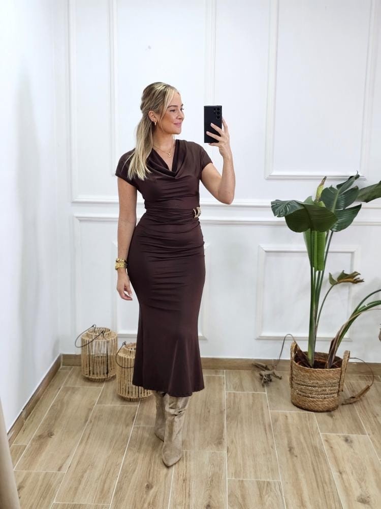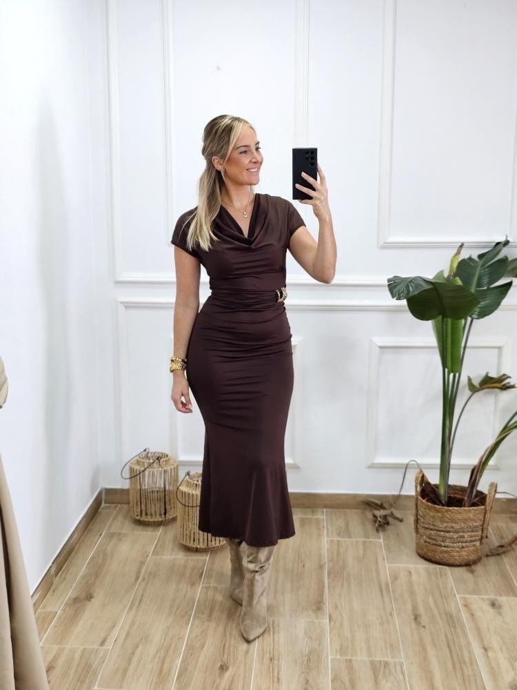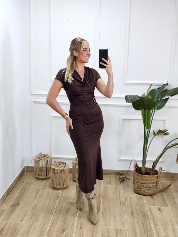 Vestido bajo en tejido de licra. Contiene manga corta. Detalle de cuello buche. Abalorio dorado en la parte delantera. Talla única y único color.