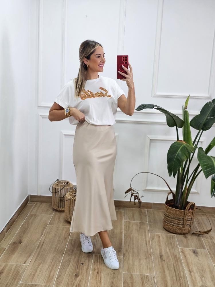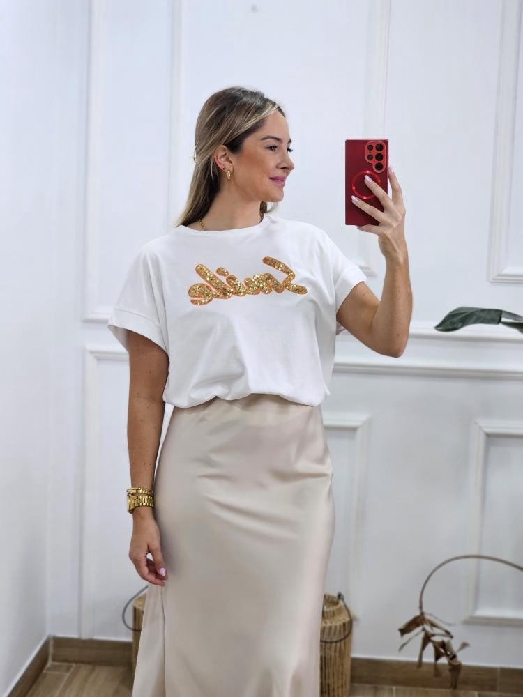 Camiseta en tejido de algodón. Contiene detalle de lentejuelas con mensaje en la zona central. Detalle de cuello redondo y manga japonesa. Talla única y único color.