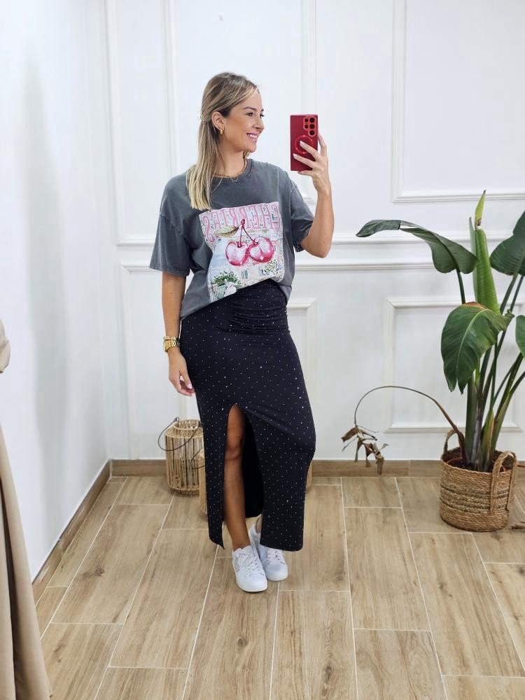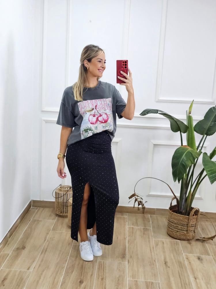 Camiseta en tejido de algodón. Contiene manga corta, cuello redondo y estampado en la zona delantera. Talla única y único color.
