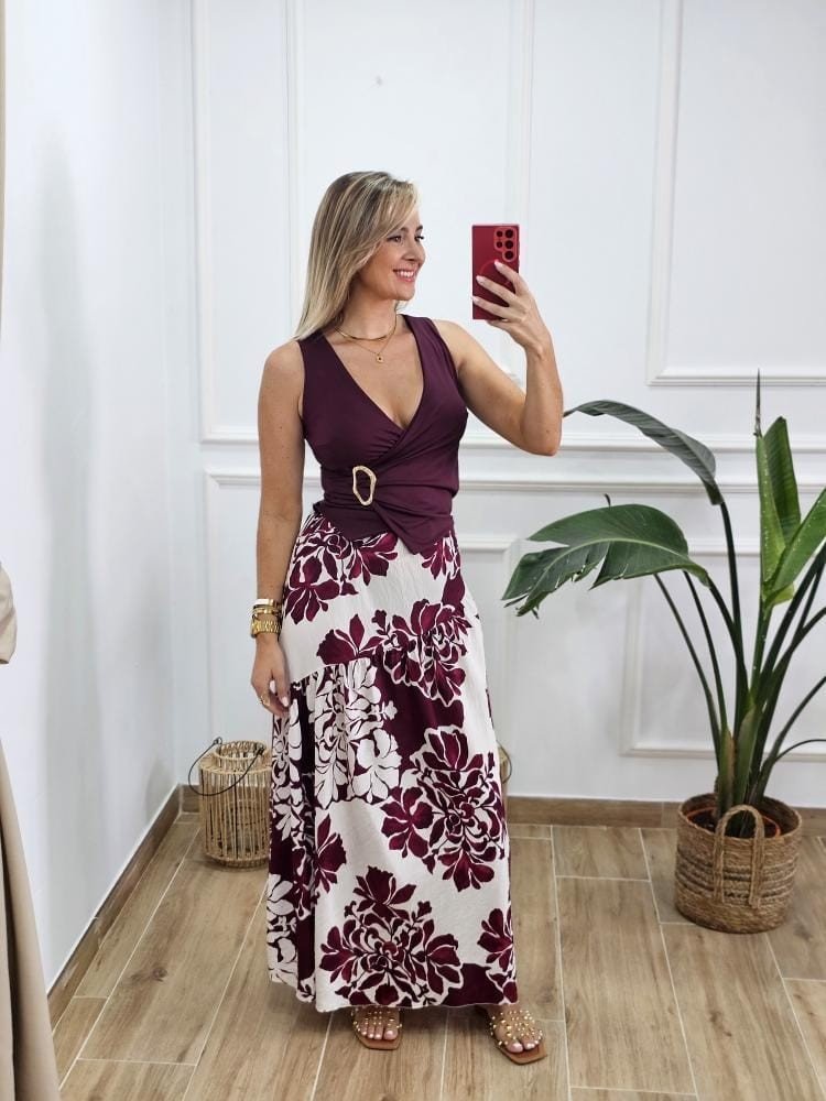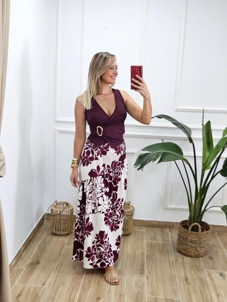 Top en tejido de poliéster con elastano. Asilla gruesa y escote cruzado (contiene cocos). Detalle de hebilla dorada en un lateral. Talla única y único color.