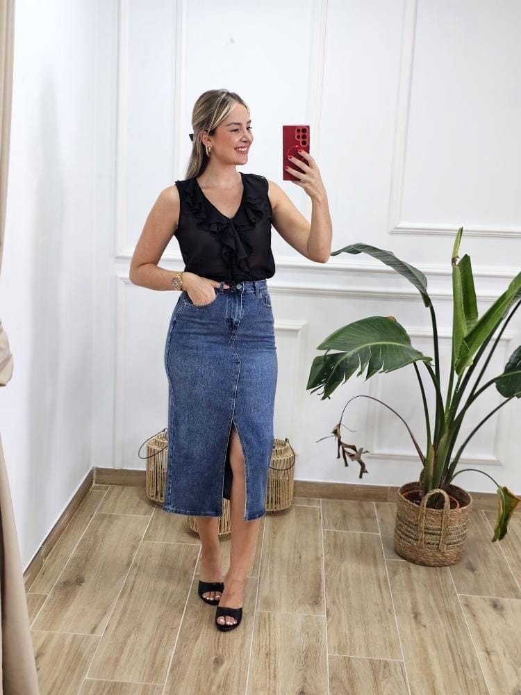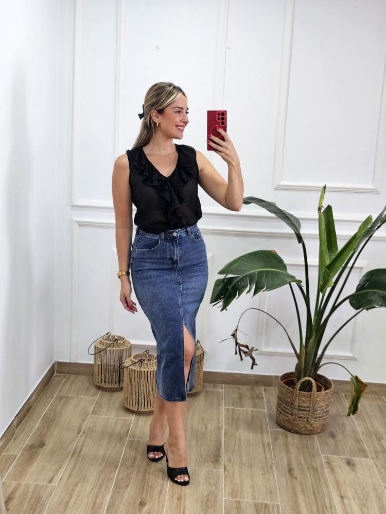 Blusa de tejido fluido sin mangas. Escote en pico y volante en la zona frontal. Por tallas y único color.
