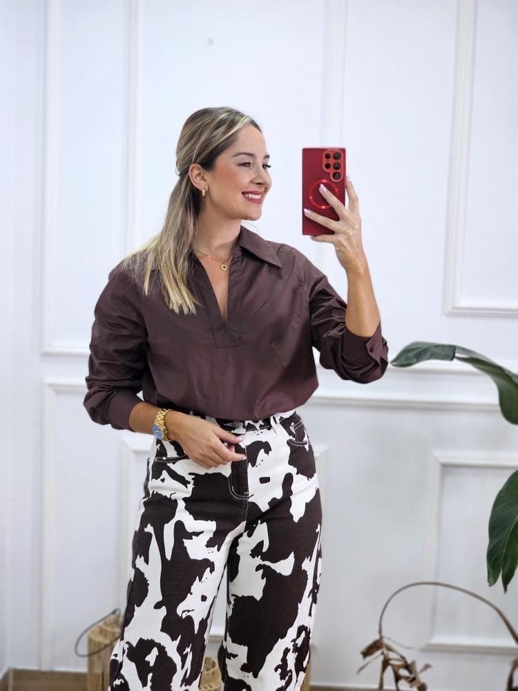 Camisa de tejido ligero. Escote en pico con cuello solapa. Manga baja con botones en la zona del puño. Por tallas y único color.