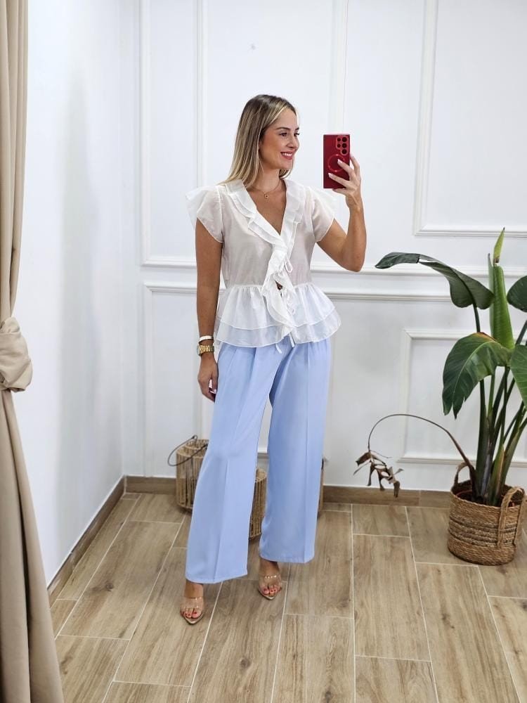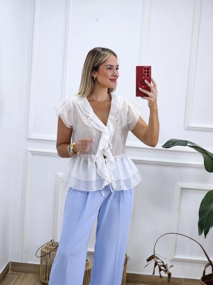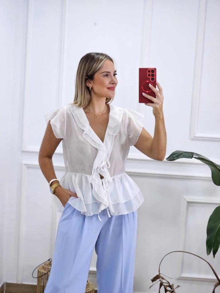 Blusa en tejido ligero con transparencias. Detalle de escote en pico con lazadas para ajustar. Manga corta con ligero volante en la misma. Volantes en la zona del pecho y zona baja de la prenda. Talla única y único color.