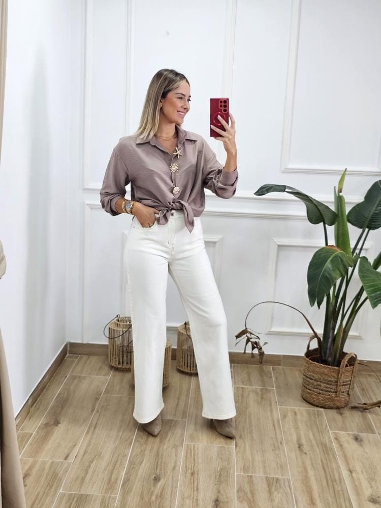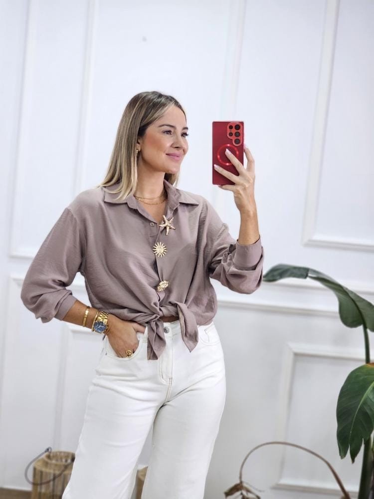 Camisa de tejido fluido de manga baja con abotonadura. Cuello solapa y abotonadura en la zona central. Detalle de broches extraíbles en la zona delantera. Talla única y único color.