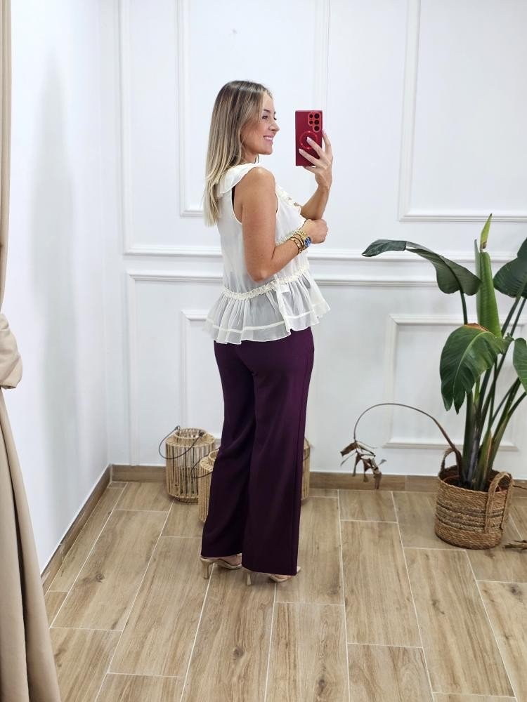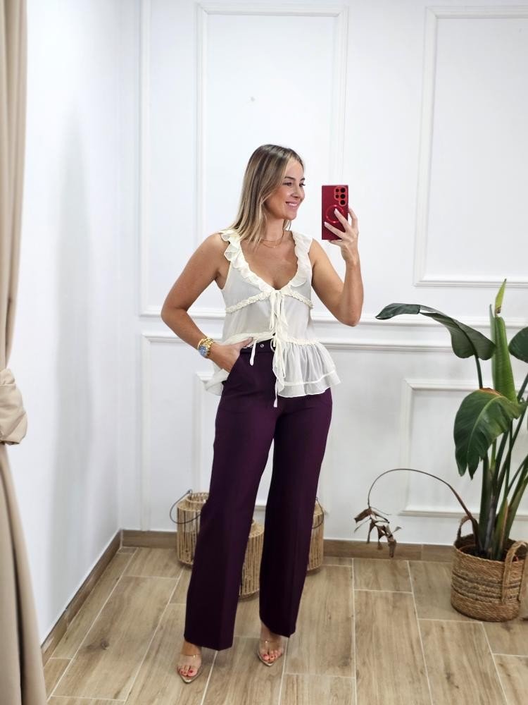 Blusa en tejido de gasa estilo boho. Contiene escote en pico con detalle de volantes a lo largo de la prenda. Lazadas en la zona central para ajustar. Por talla y único color.