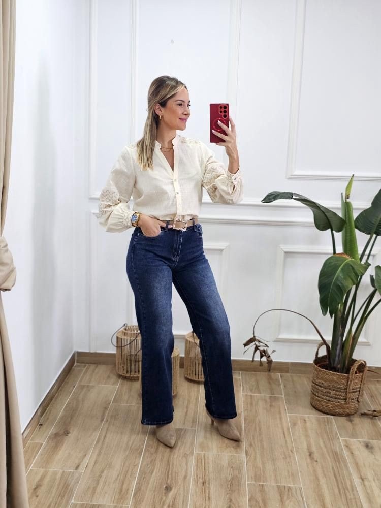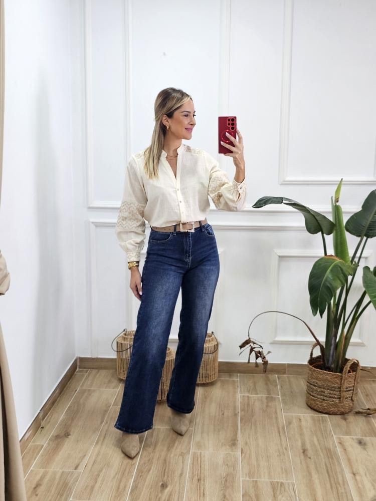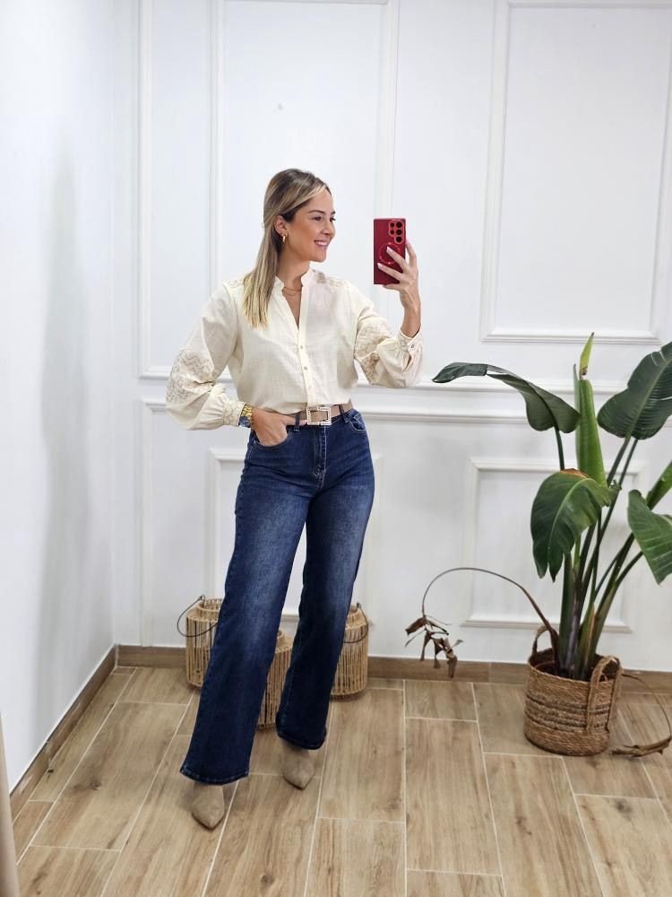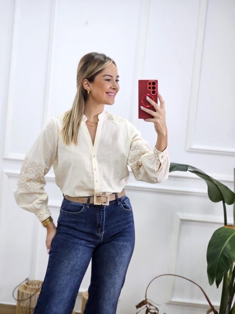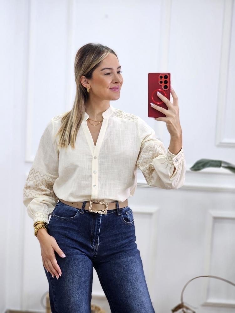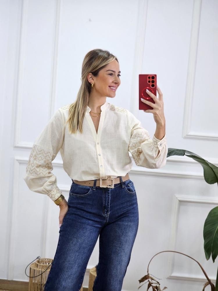 Camisa en tejido ligero con detalle de bordados a lo largo de la prenda. Manga baja con abotonadura en el puño. Cuello mao con abotonadura en la zona central. Por tallas y único color.