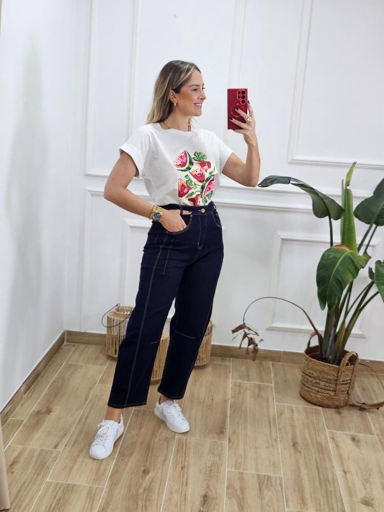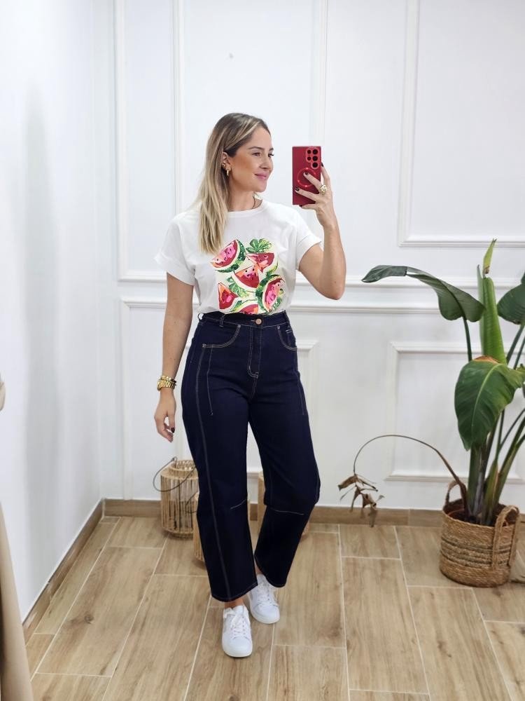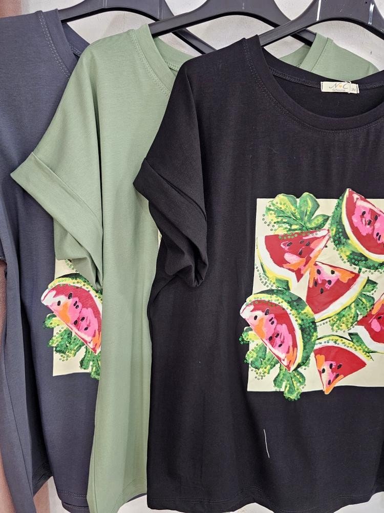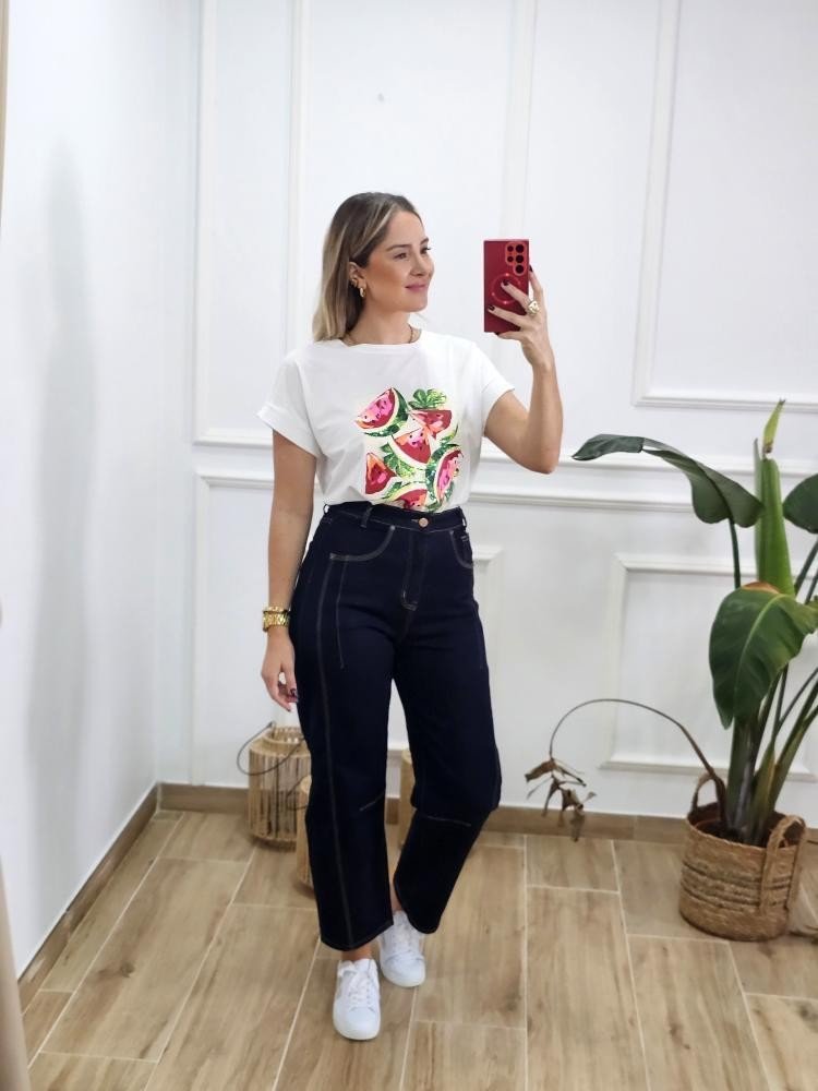 Camiseta básica de manga corta con detalle de estampado en la zona delantera. Contiene cuello redondo. Por tallas y varios colores.