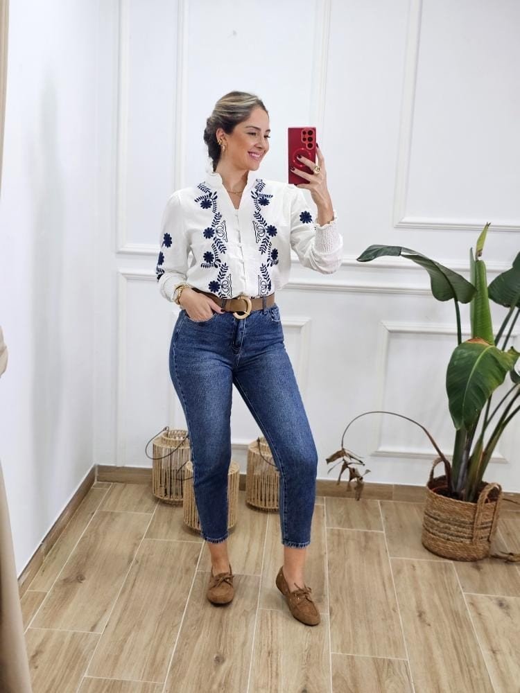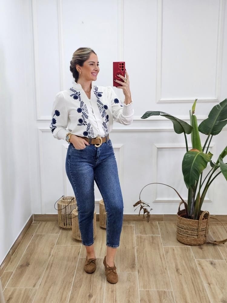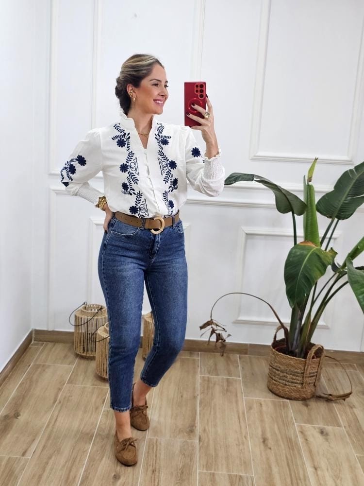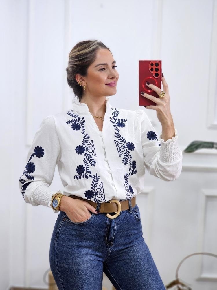Camisa de tejido fluido de manga baja. Nido de abeja en la zona de los puños. Cuello mao con ligero volante. Abotonado en la zona central. Por tallas y único color.