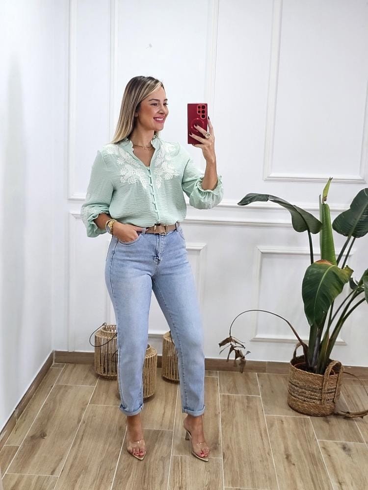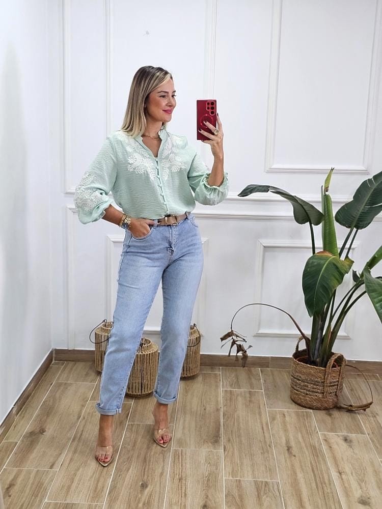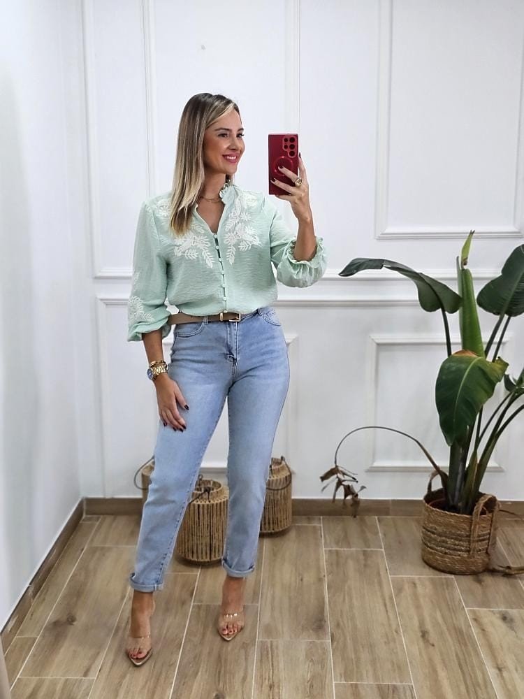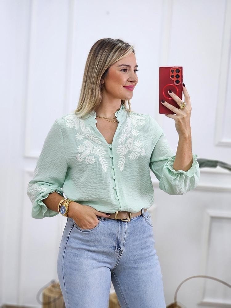 Camisa de tejido fluido de manga baja y cuello mao con volante en el mismo. Abotonada en la zona central y detalle de bordados a lo largo de la prenda. Por tallas y único color.