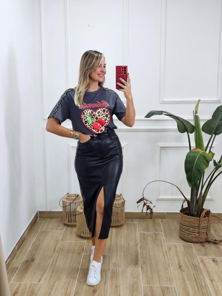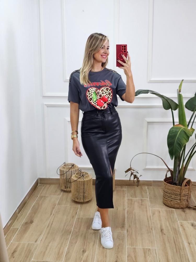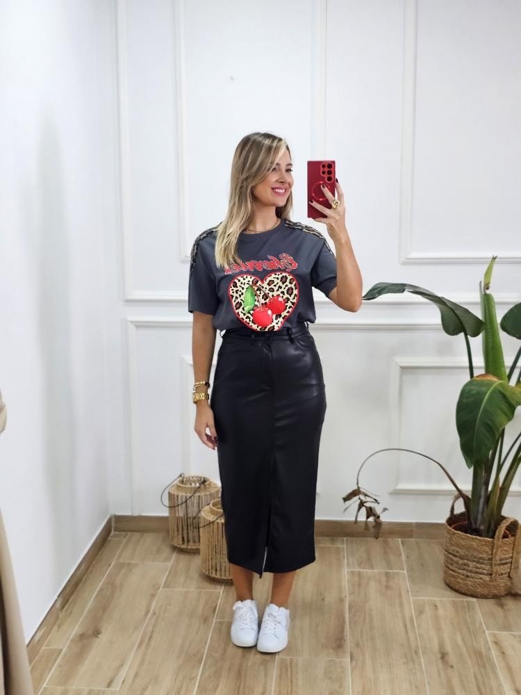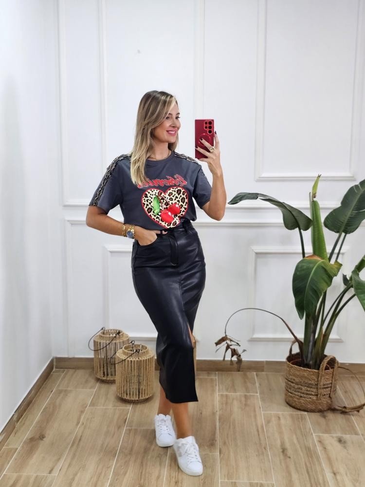 Camiseta básica en tejido de algodón. Contiene cuello redondo y manga corta. Detalle estampado en la zona central. Detalle animal print en las mangas. Por tallas y varios colores.
