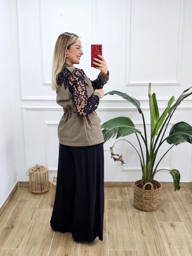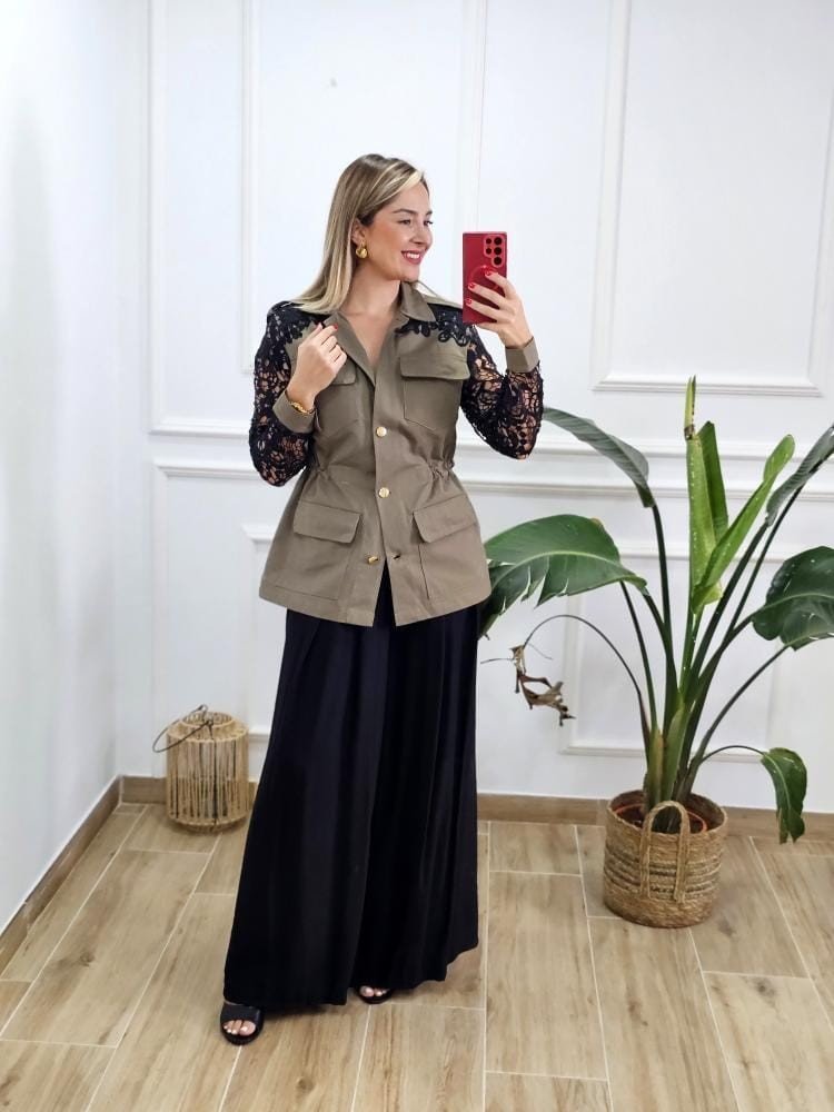 Pantalón largo en tejido fluido. Contiene elástico en la cintura y detalle de cinto extraíble en tejido de rafia. Bolsillos delanteros y con pinzas. Talla única y dos colores.