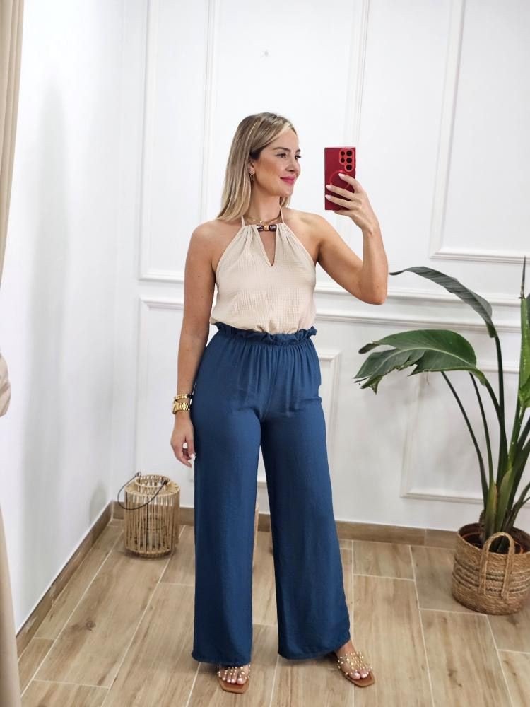 Pantalón en tejido fluido. Contiene elástico en la zona de la cintura. Talla única y único color.
