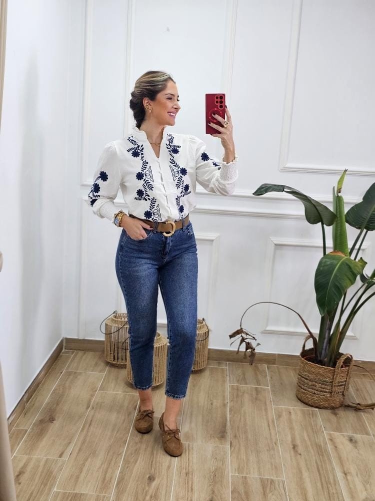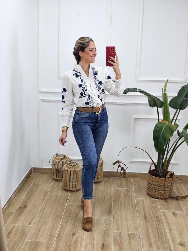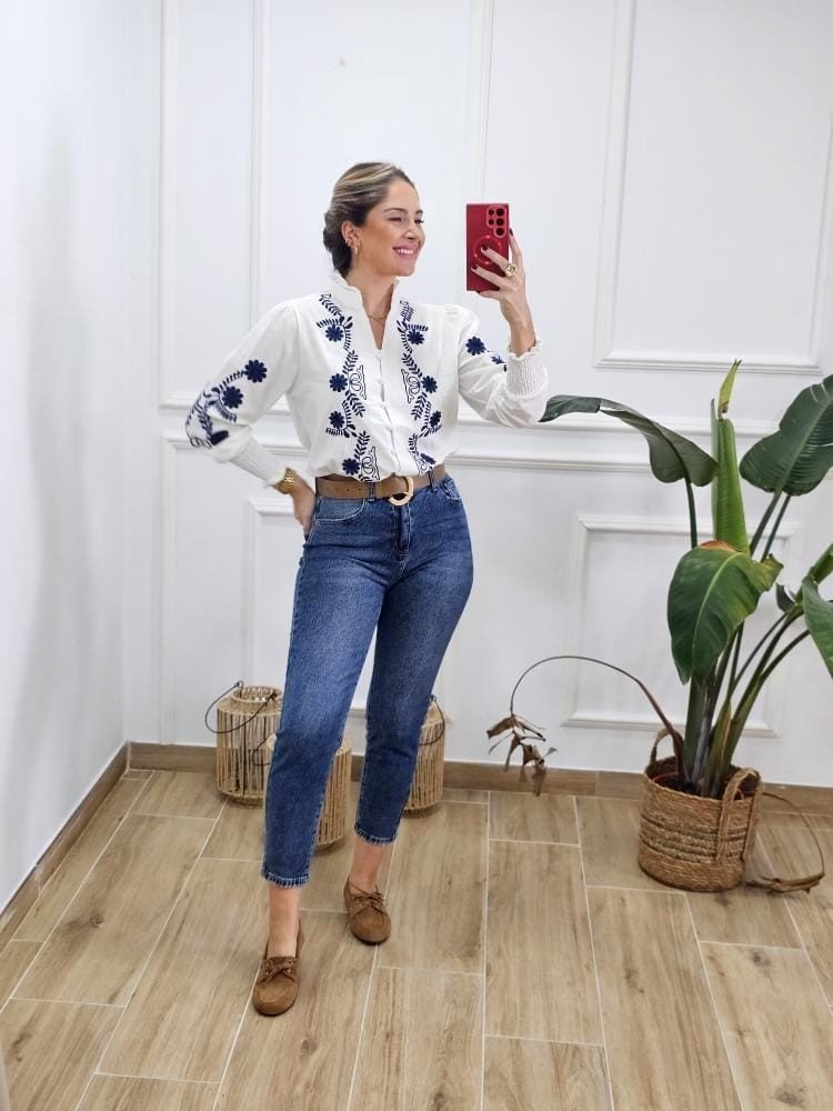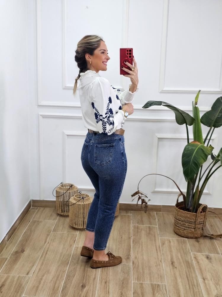 Jeans estilo mom fit, contiene elastano. Detalle de bolillos en zona delantera y trasera, así como, cremallera en la zona delantera. Por tallas y único color.