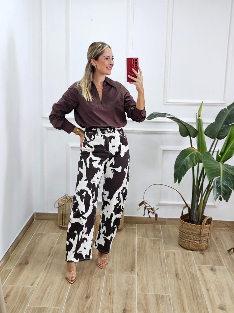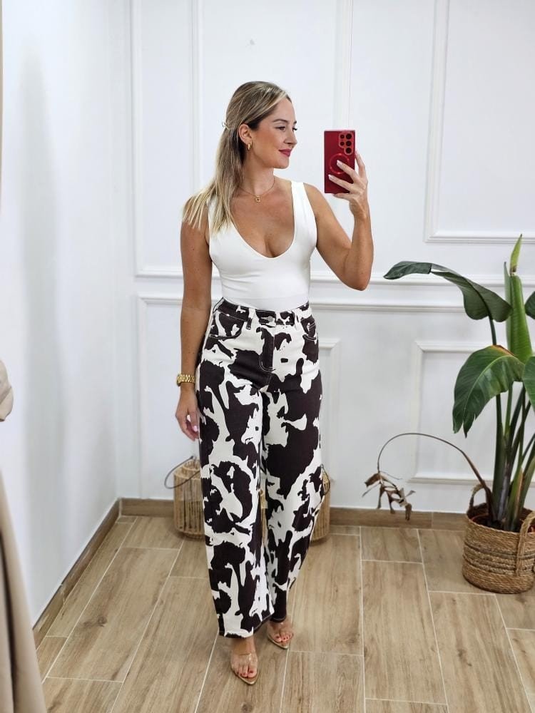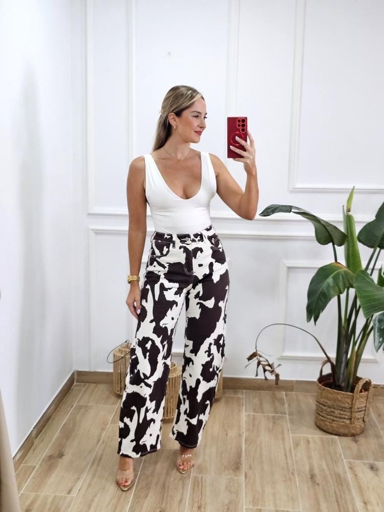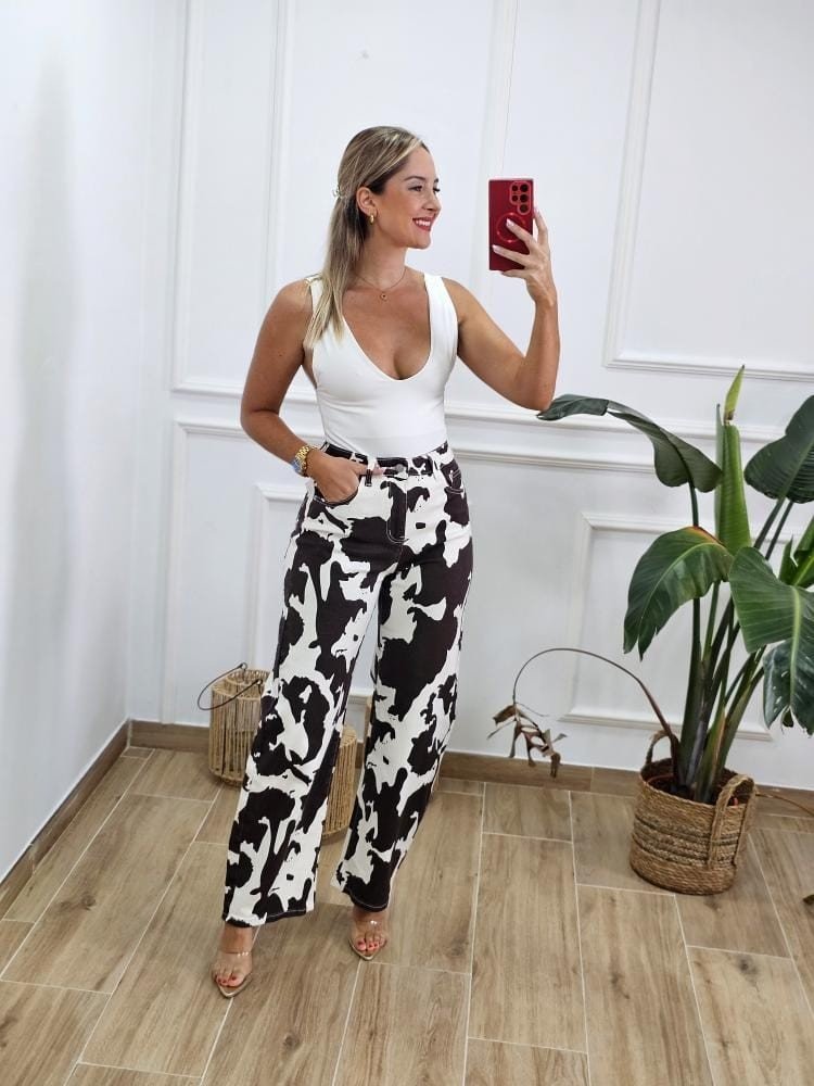 Jeans en tejido denim estampado de vaca. Corte recto. Contiene elastano. Detalle de bolsillos en la parte delantera y trasera de la prenda. Cremallera con botón en la zona central. Por tallas y único color.