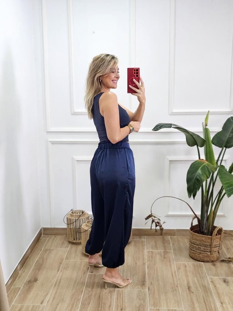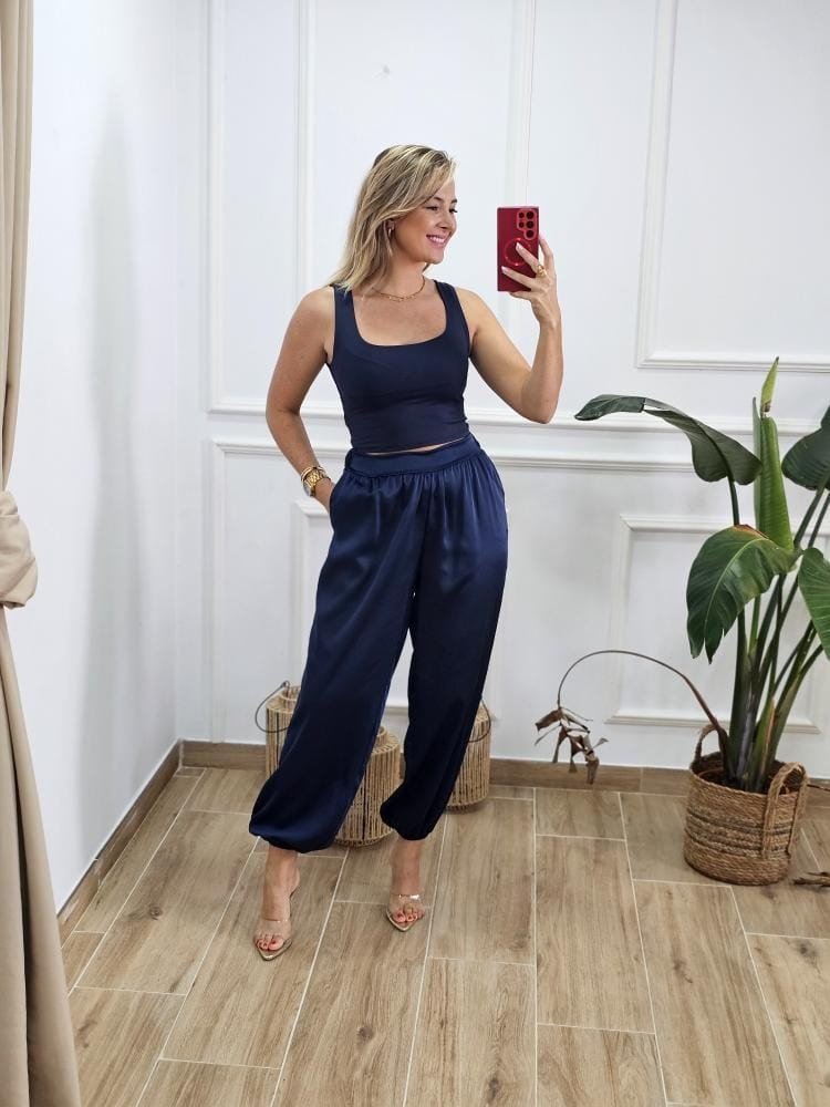 Pantalón satina corte aladino. Contiene Pretina elástica en la zona de la cintura. Detalle de pretina en la zona baja. Talla única y único color. NOTA: color azul marino.