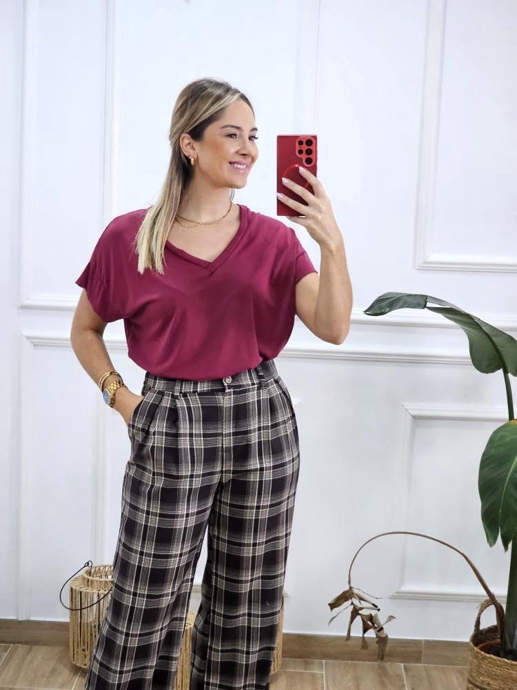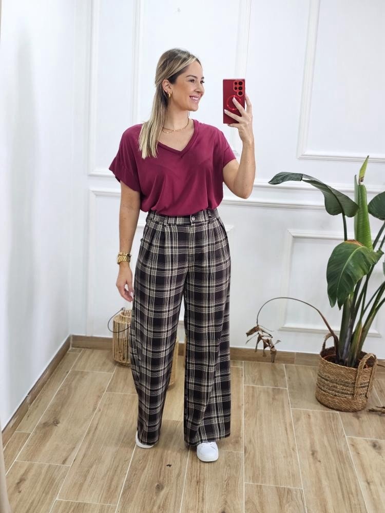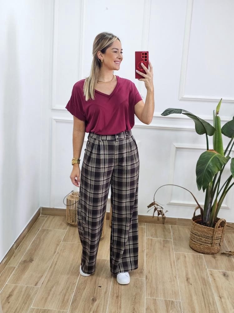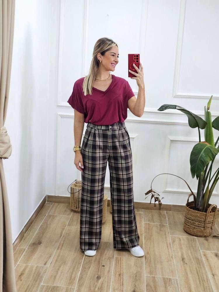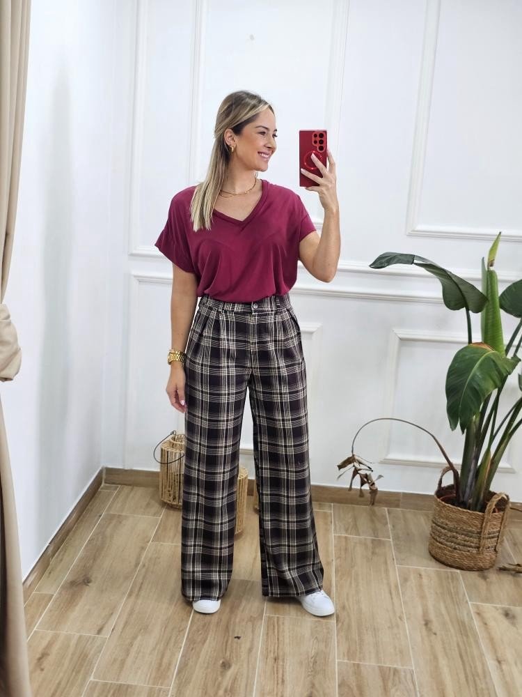 Pantalón bajo en tejido fluido con estampado tartán. Contiene bolsillos en ambos laterales. Detalle de cremallera con botón en la zona central. Por tallas y único color.