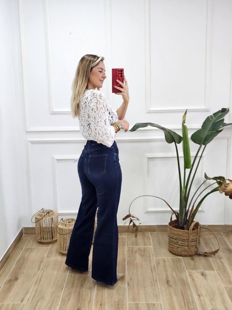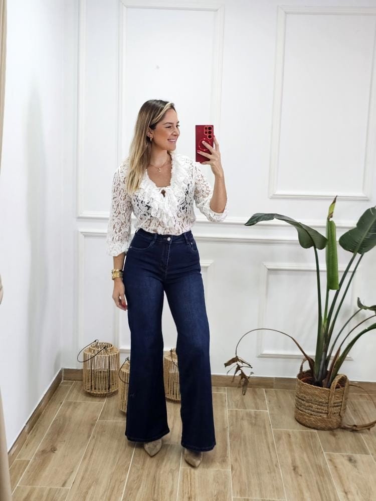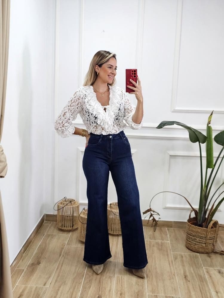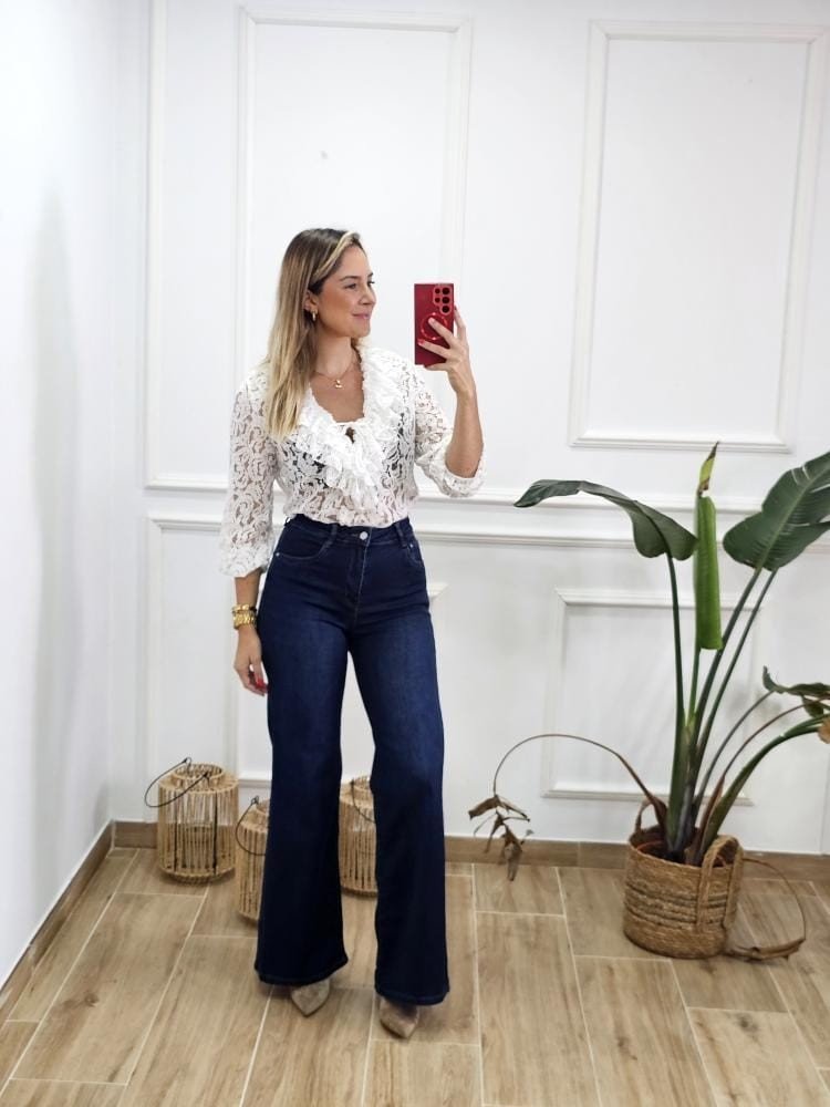 Jeans de tejido de elastano. De corte recto y tiro alto. Detalle de bolsillos traseros y delanteros y cremallera en la zona central. Por tallas y único color.