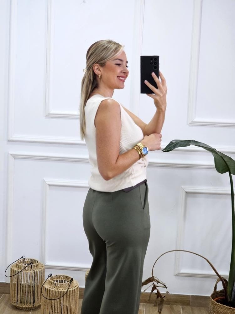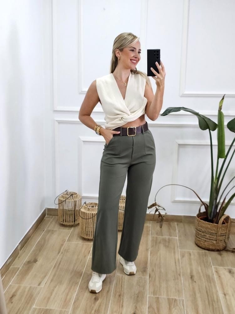 Pantalón de pierna ancha, hace efecto pinza. Contiene elástico en la zona de la cintura, detalle de bolsillos laterales e incluye cinto en color chocolate. Por tallas y único color.